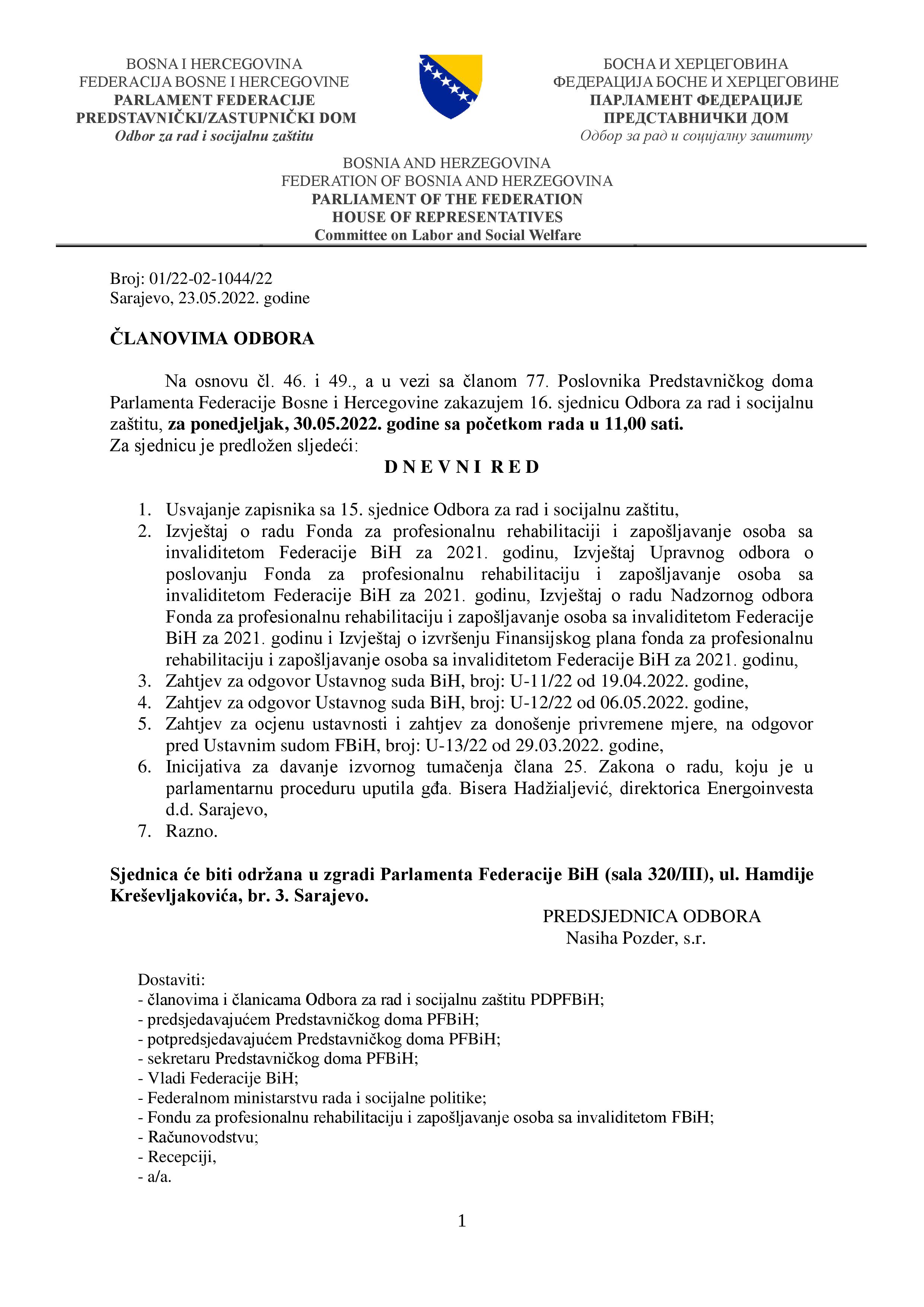 Poziv za 16. sjednicu Odbora za rad i socijalnu zaštitu