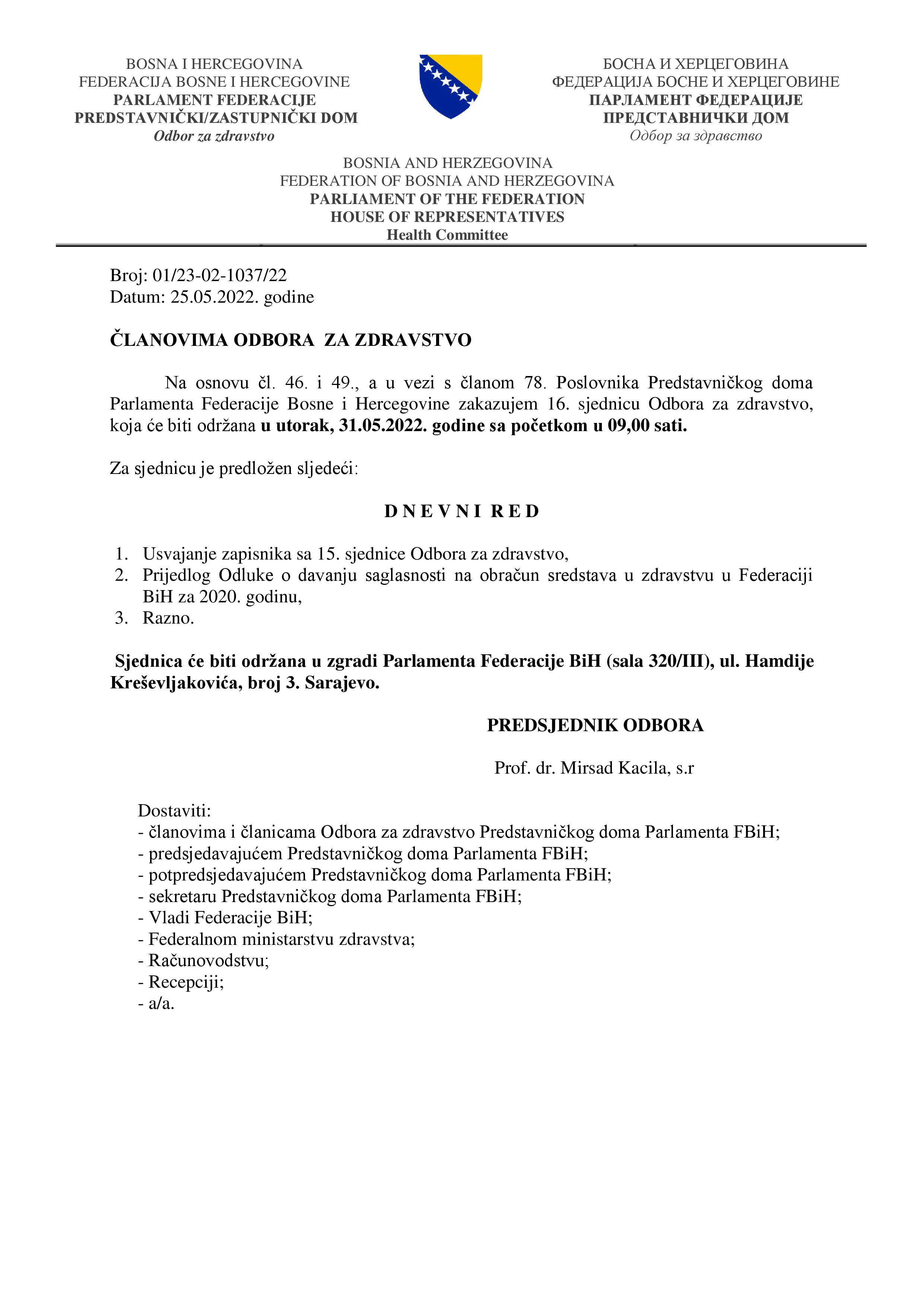 Poziv za 16. sjednicu Odbora za zdravstvo