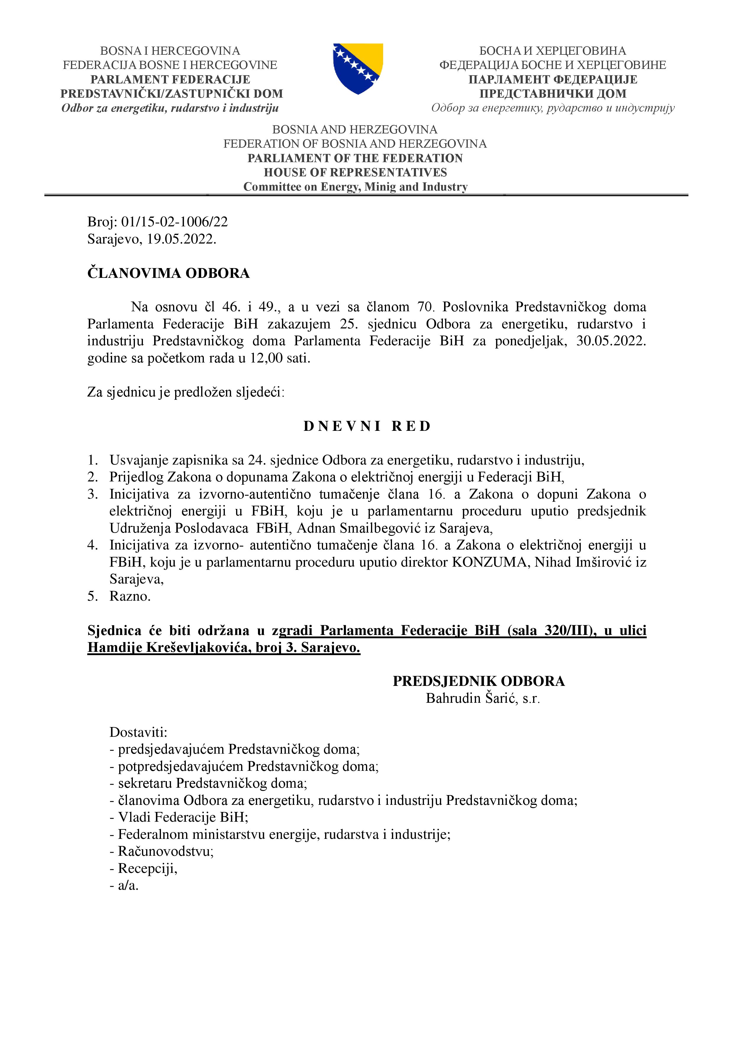 Poziv za 25. sjednicu Odbora za energetiku, rudarstvo i industriju