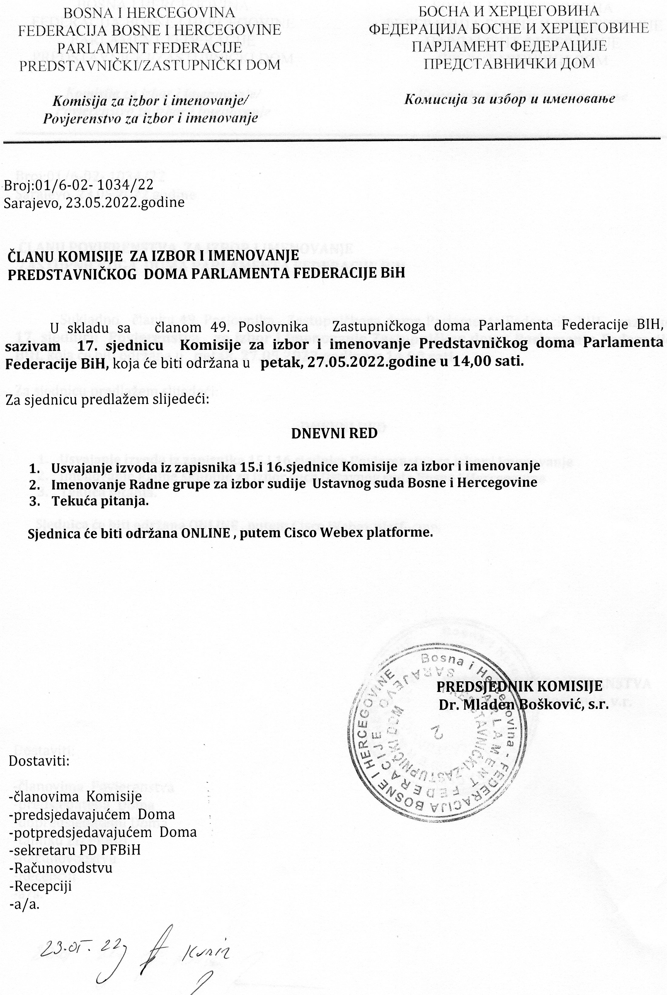 Poziv za 17. sjednicu Komisije za izbor i imenovanje