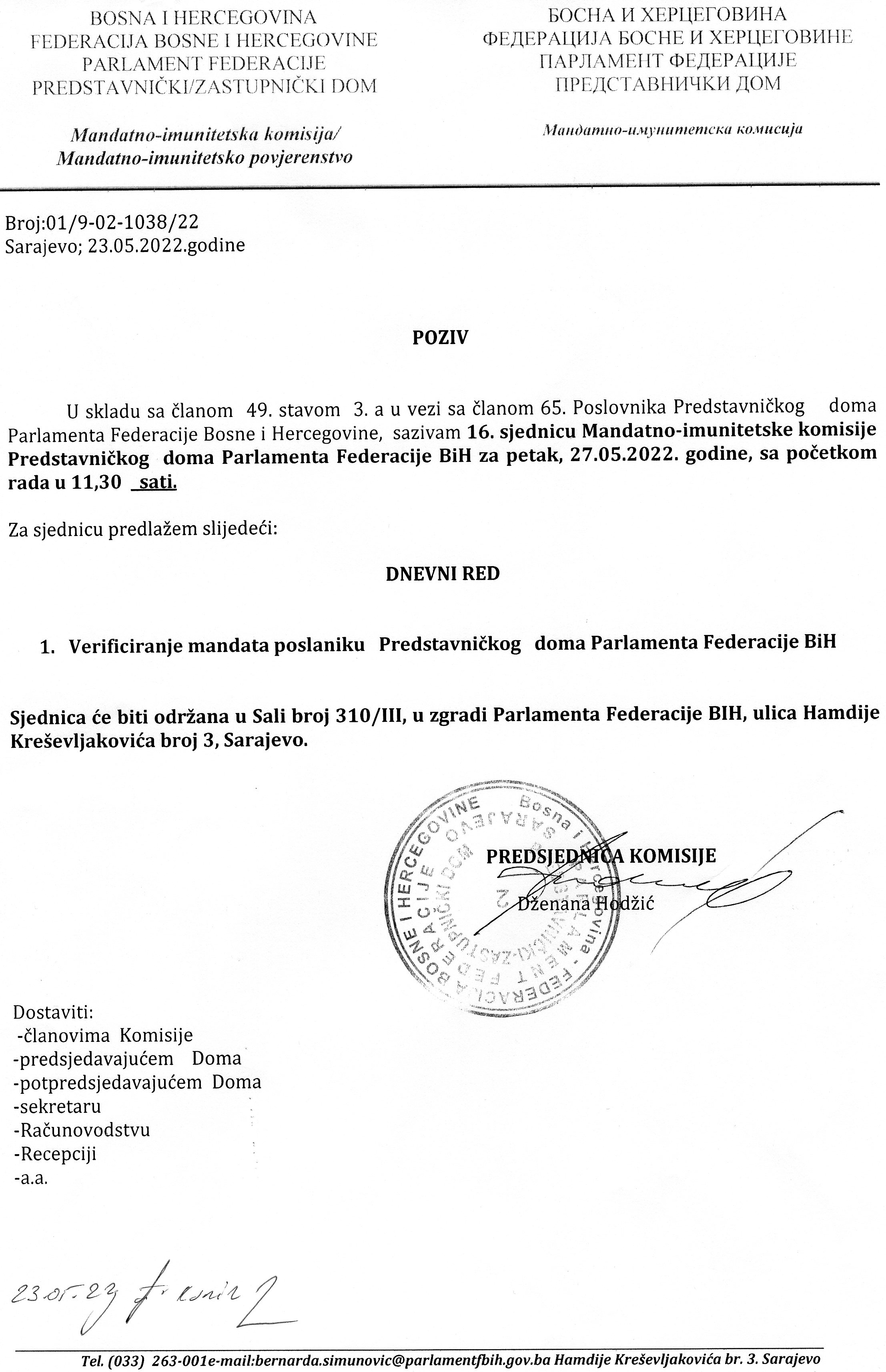 Poziv za 16. sjednicu Mandatno-imunitetske komisije