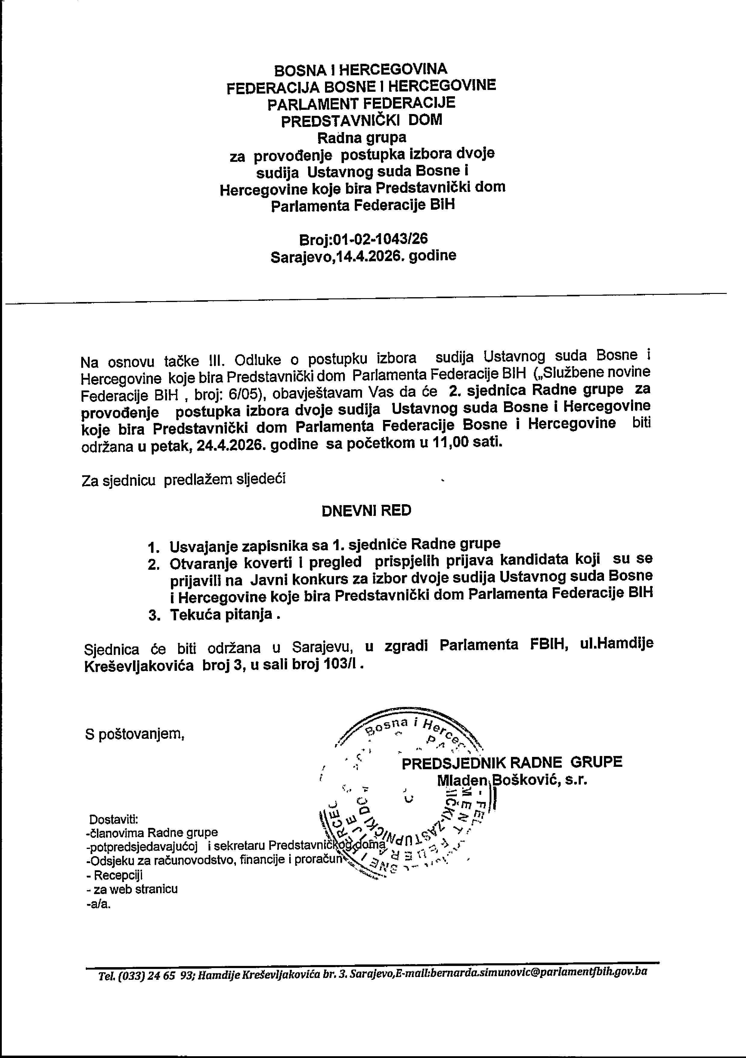 Poziv za 2. sjednicu Radne skupine za provedbu postupka izbora dvoje sudija Ustavnog suda BiH koje bira Predstavnički dom Parlamenta FBiH 15.04.2026 Najave