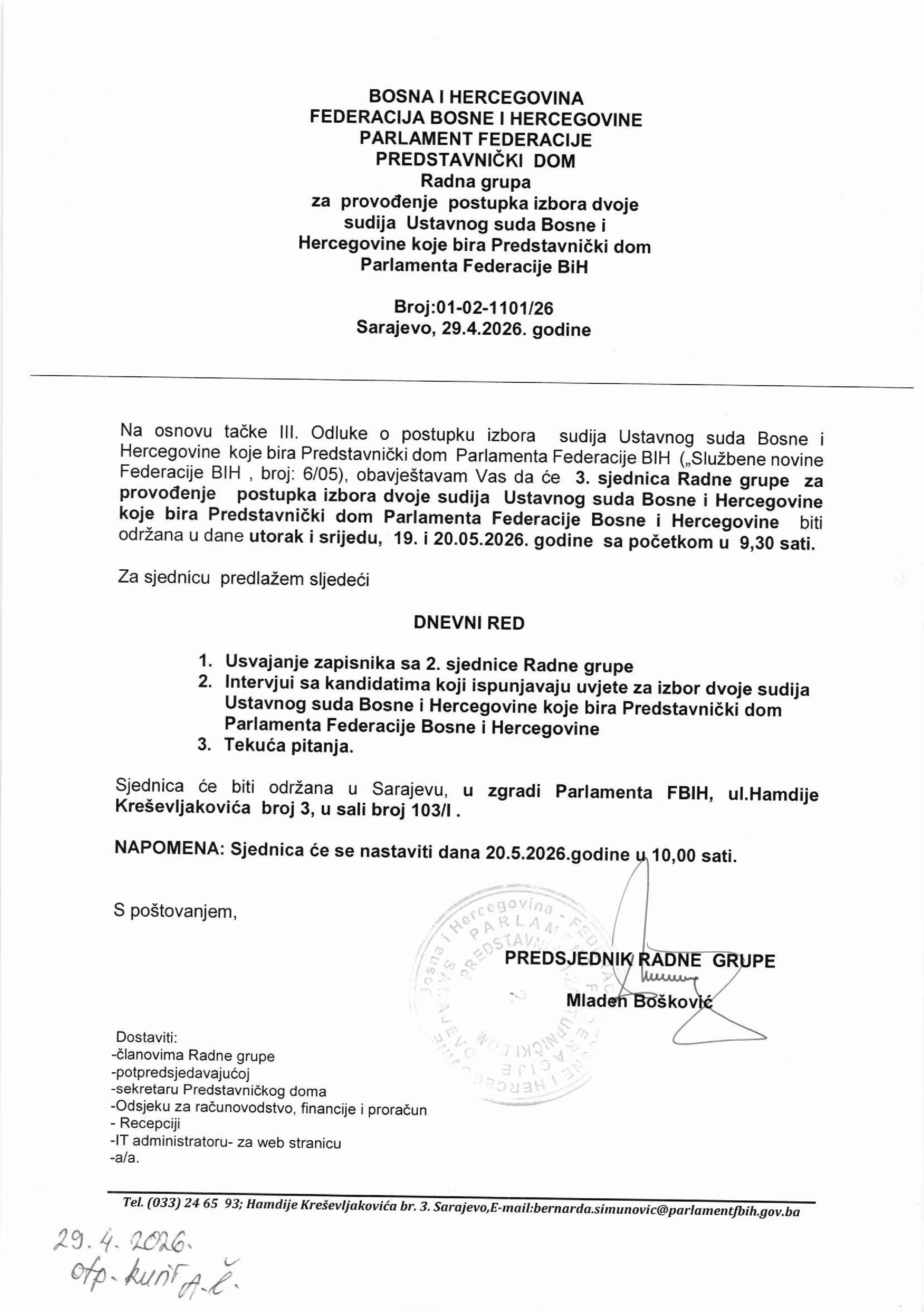 Poziv za 3. sjednicu Radne skupine za provedbu postupka izbora dvoje sudija Ustavnog suda BiH koje bira Predstavnički dom Parlamenta FBiH 29.04.2026 Najave