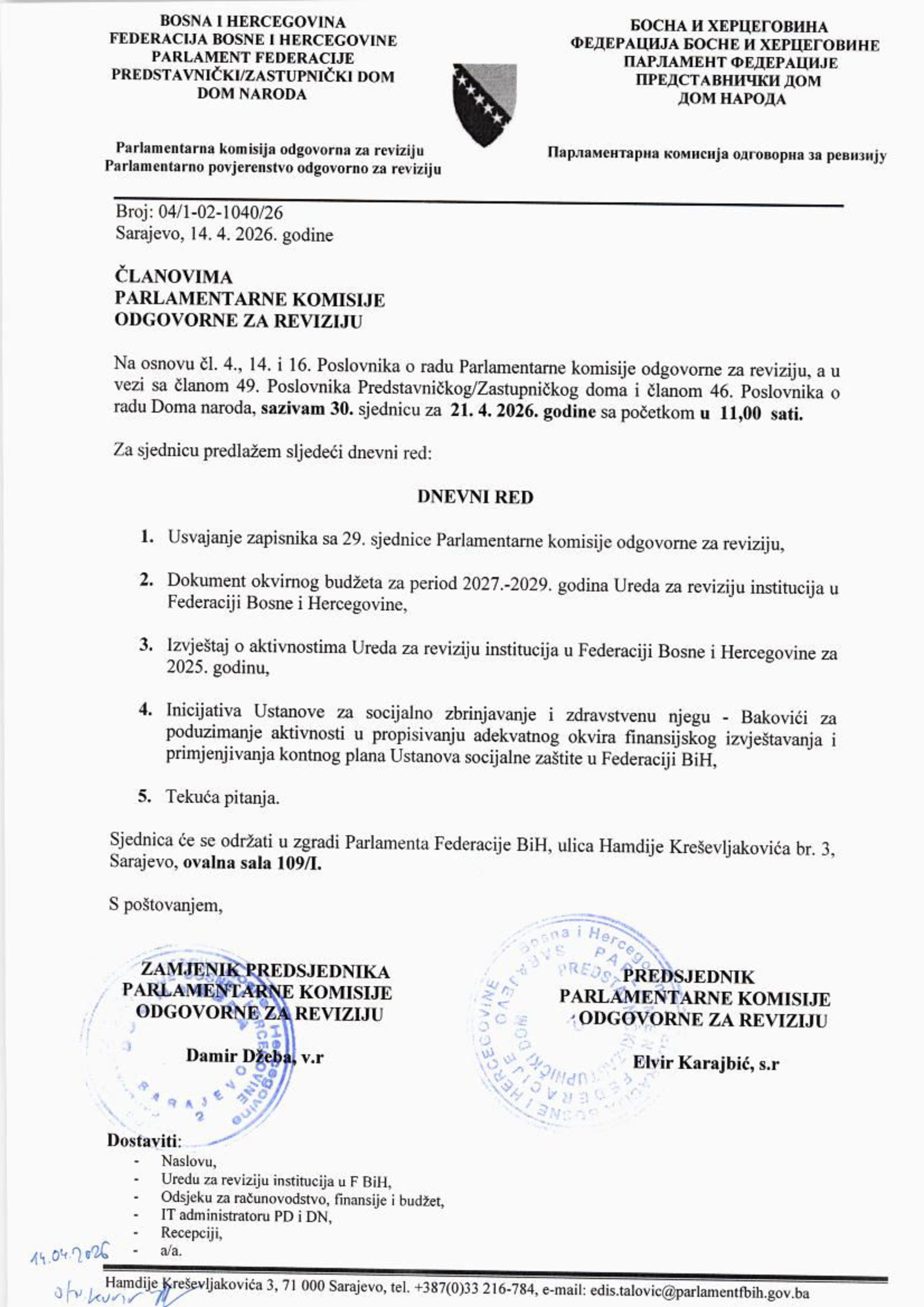 Poziv za 30. sjednicu Parlamentarne komisije odgovorne za reviziju