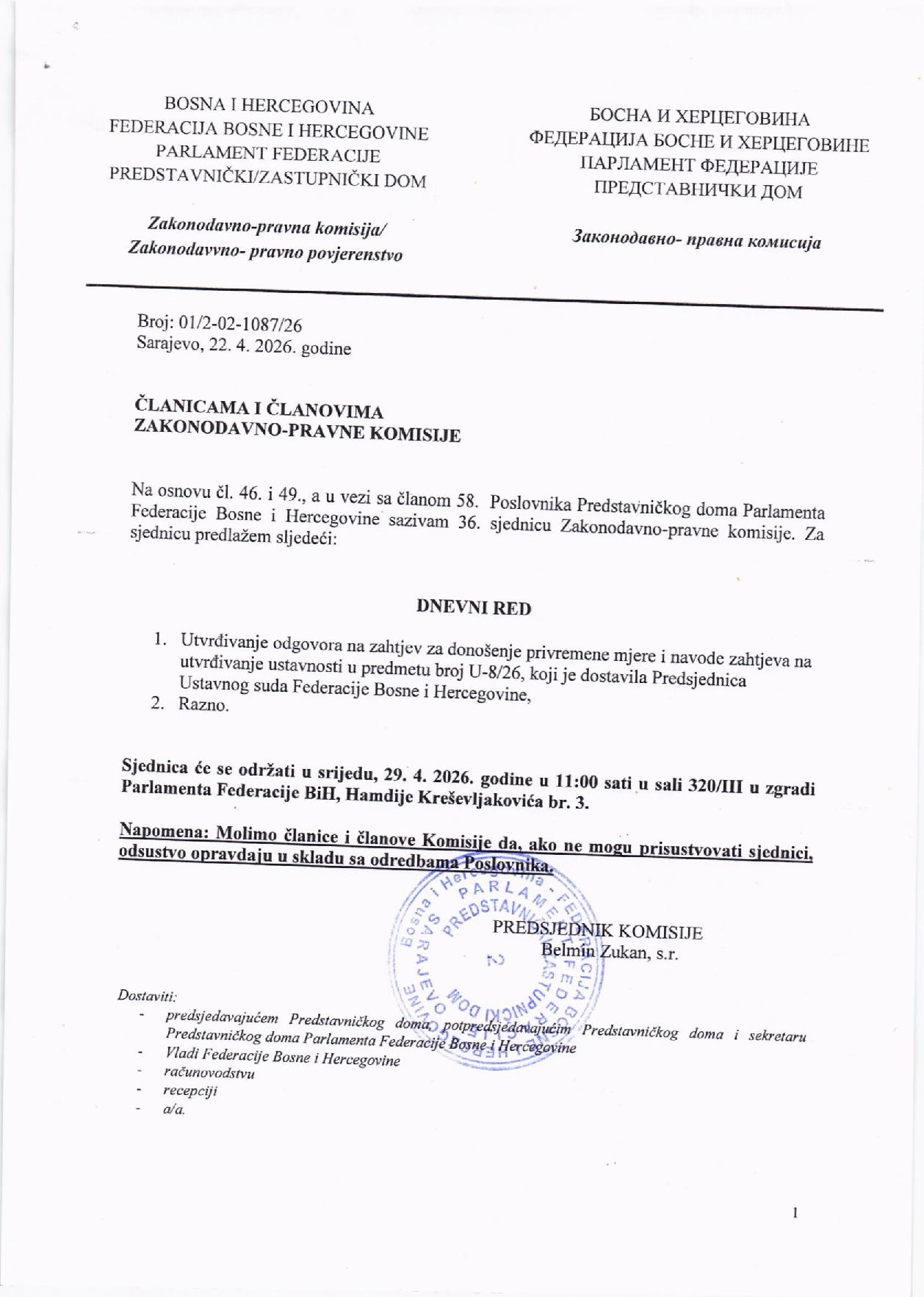 Poziv za 36. sjednicu Zakonodavno-pravne komisije