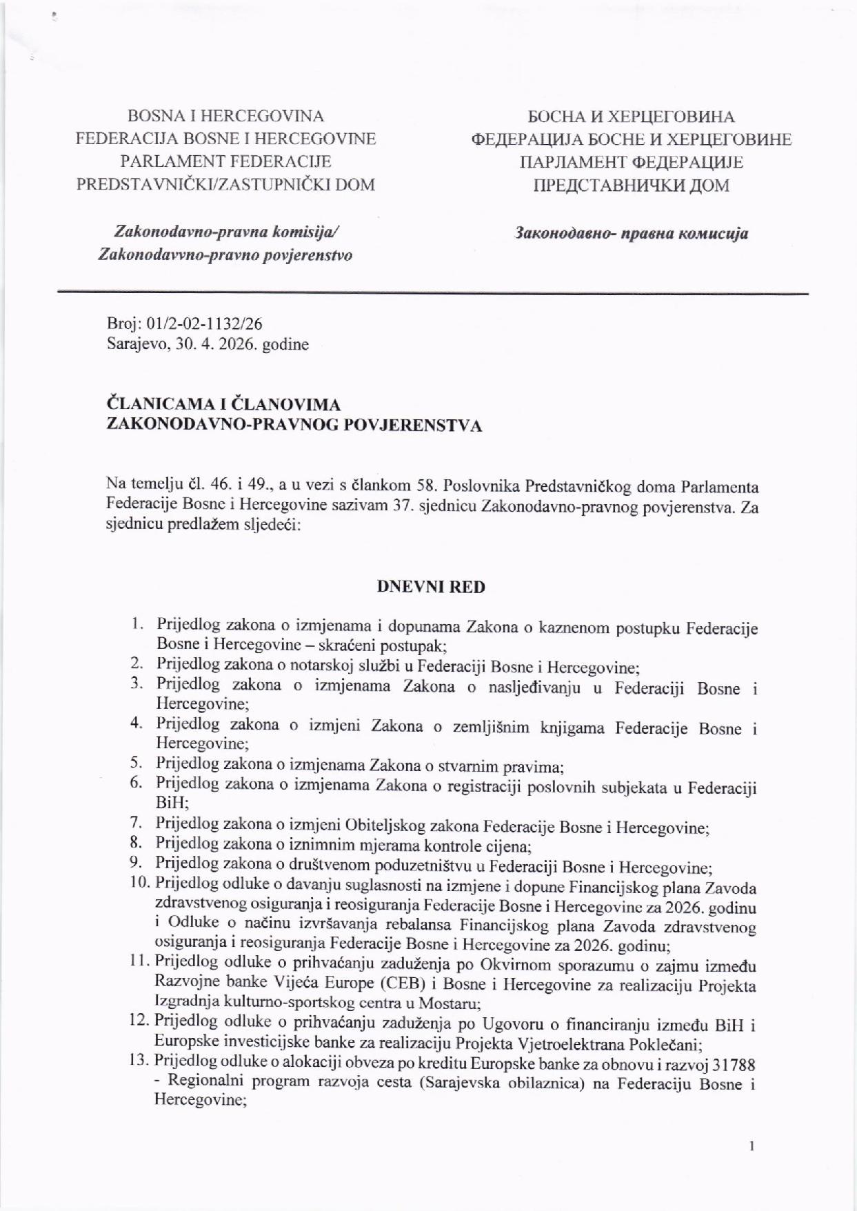 Poziv za 37. sjednicu Zakonodavno-pravnog povjerenstva
