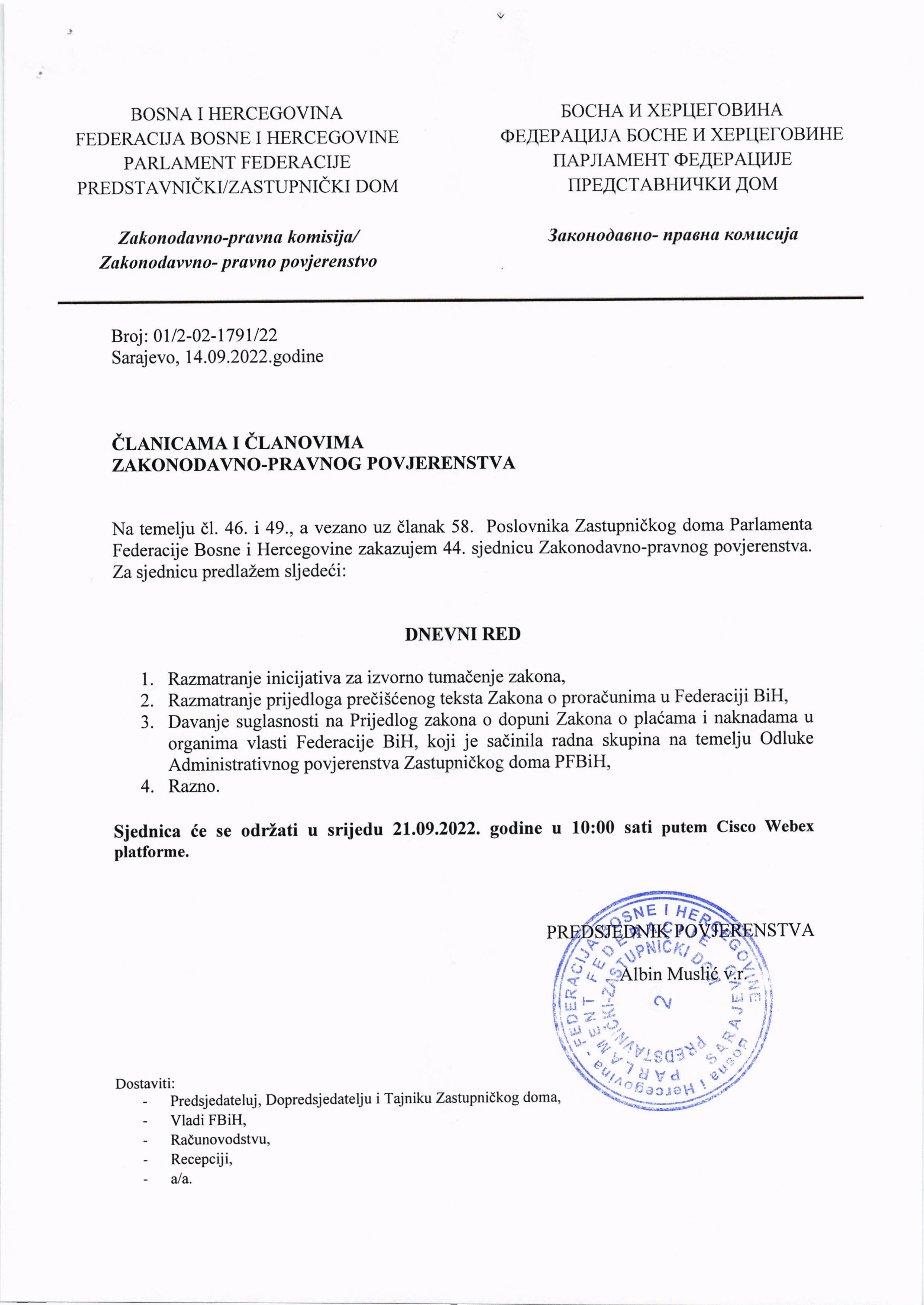 Poziv za 44. sjednicu Zakonodavno-pravnog povjerenstva