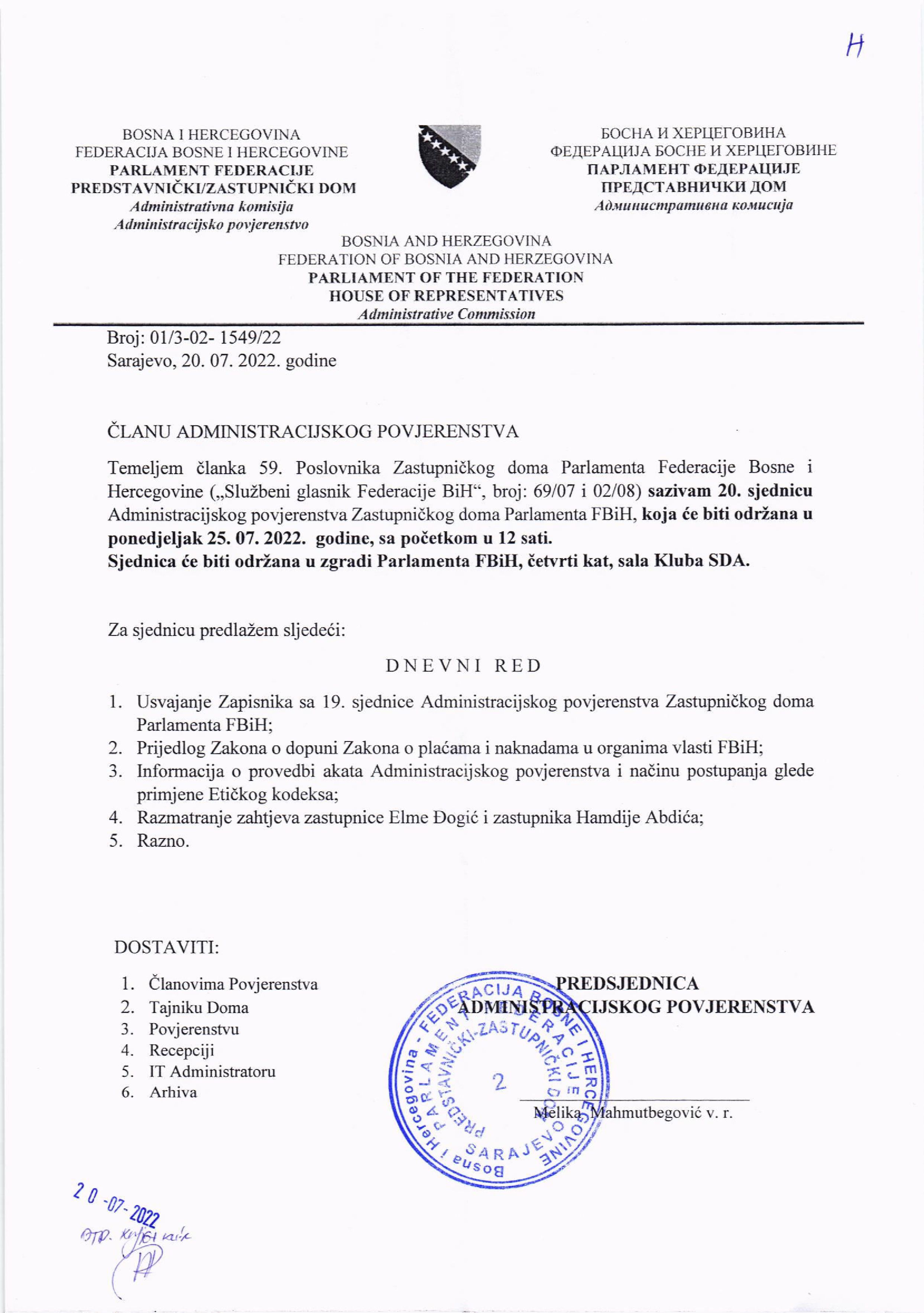 Poziv za 20. sjednicu Administrativnog povjerenstva