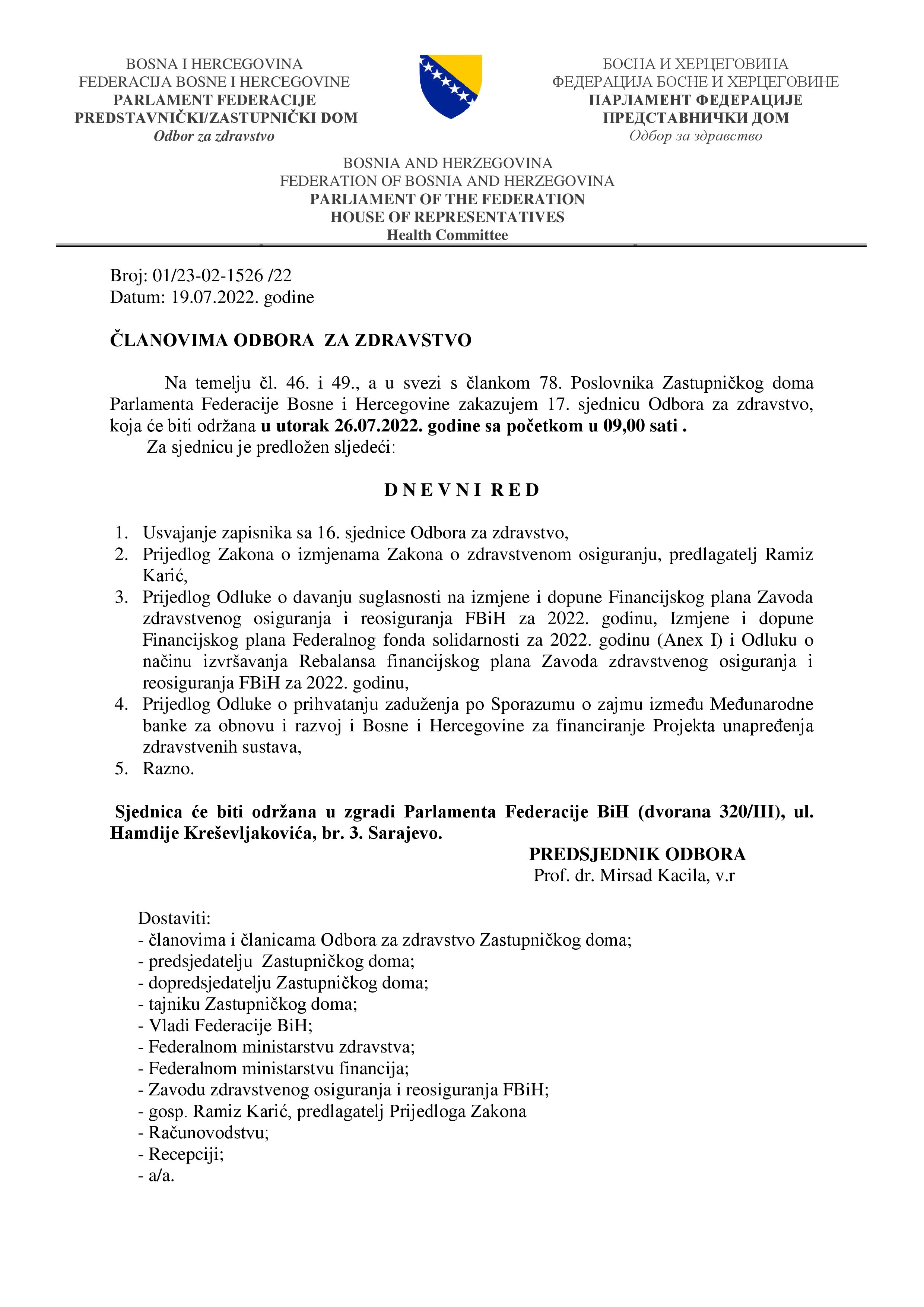 Poziv za 17. sjednicu Odbora za zdravstvo