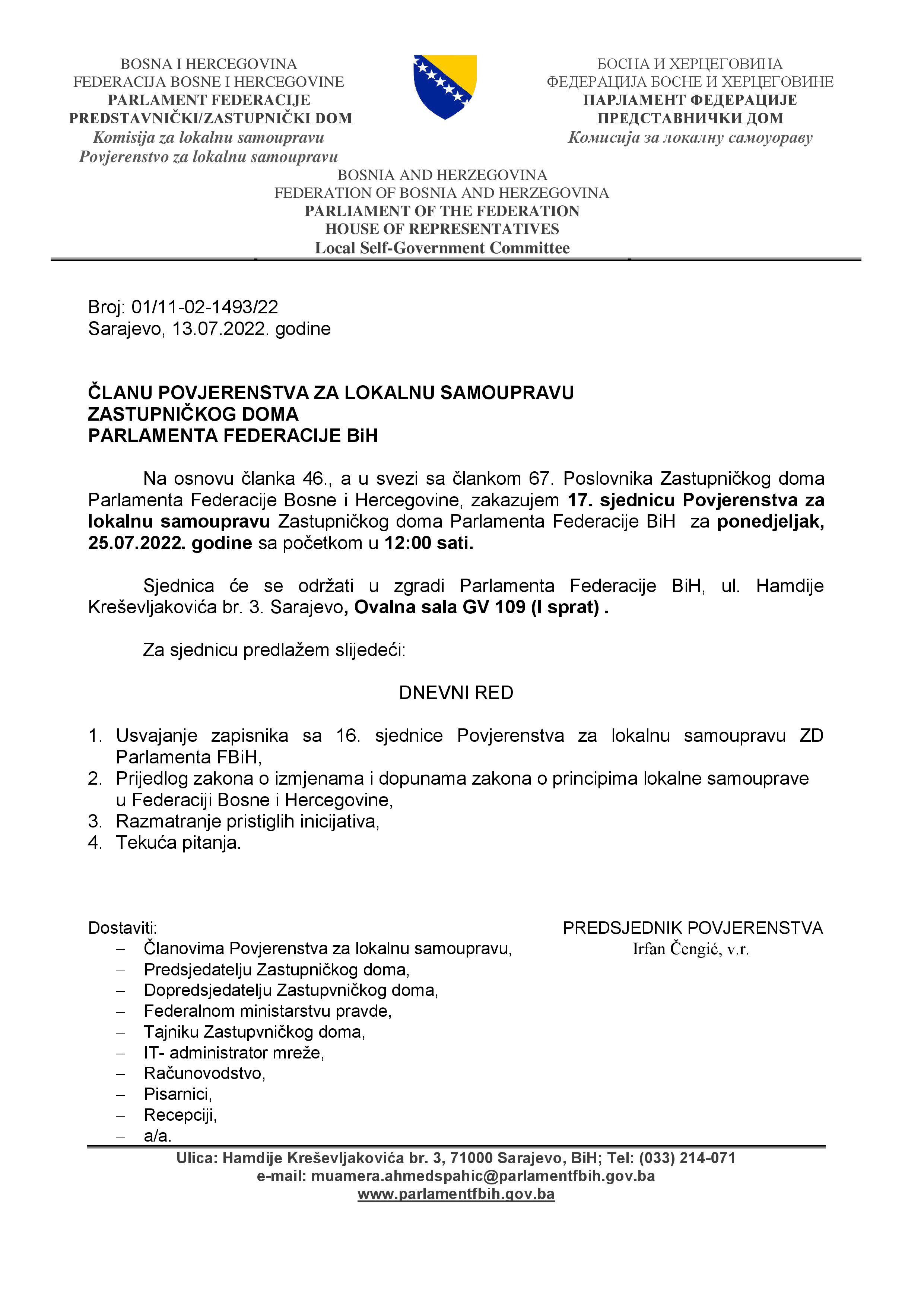 Poziv za 17.sjednicu Povjerenstva za lokalnu samoupravu