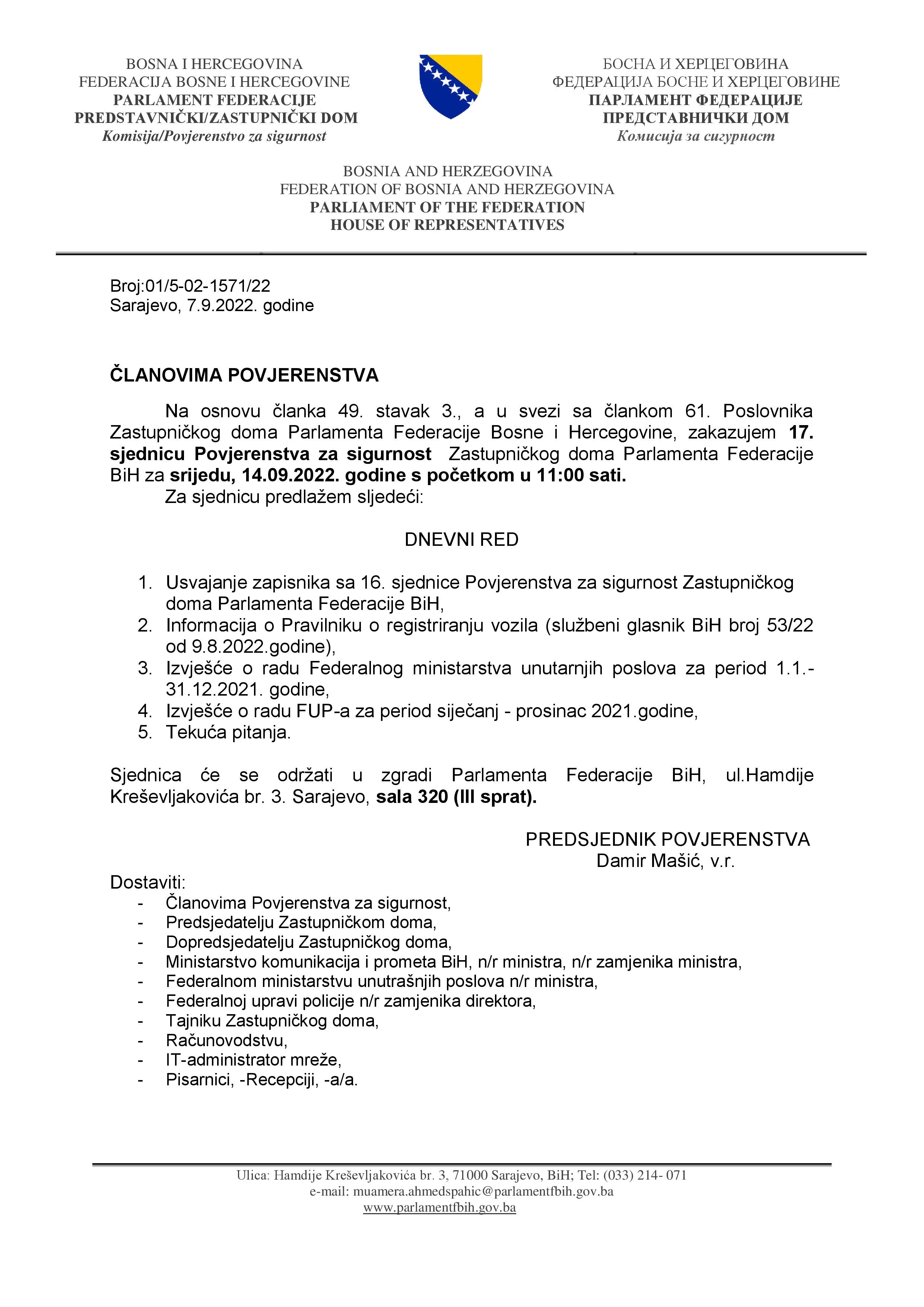Poziv za 17. sjednicu Povjerenstva za sigurnost