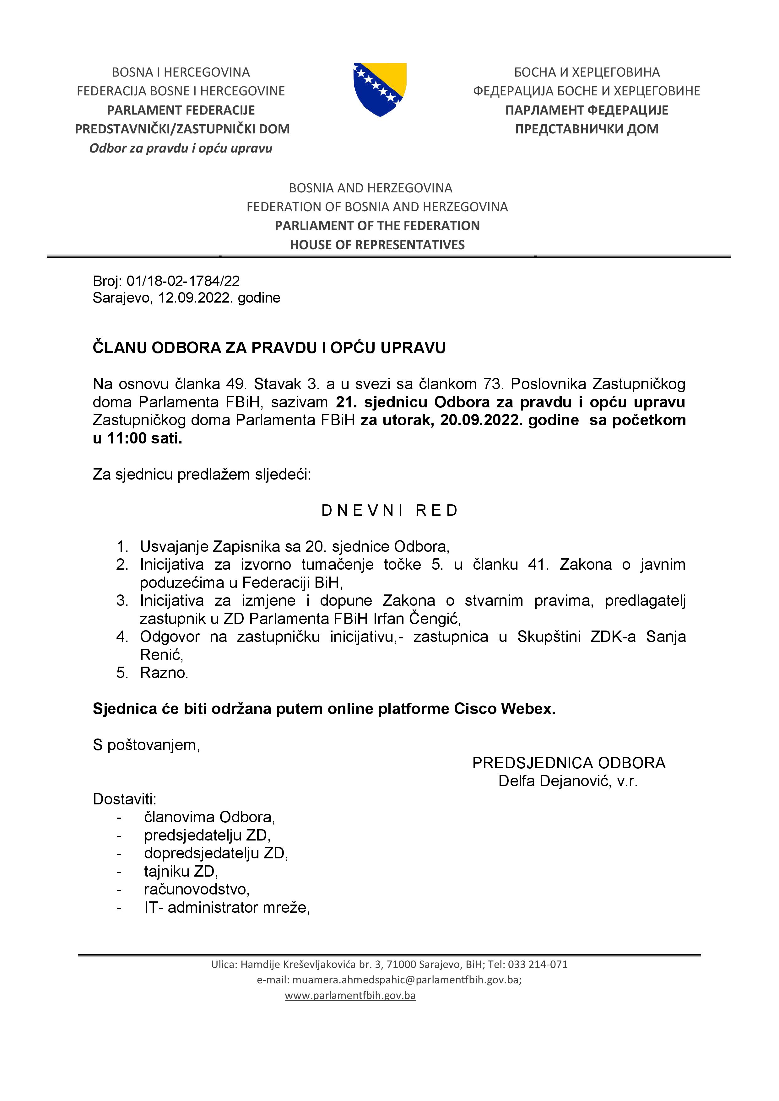Poziv za 20. sjednicu Odbora za pravdu i opću upravu