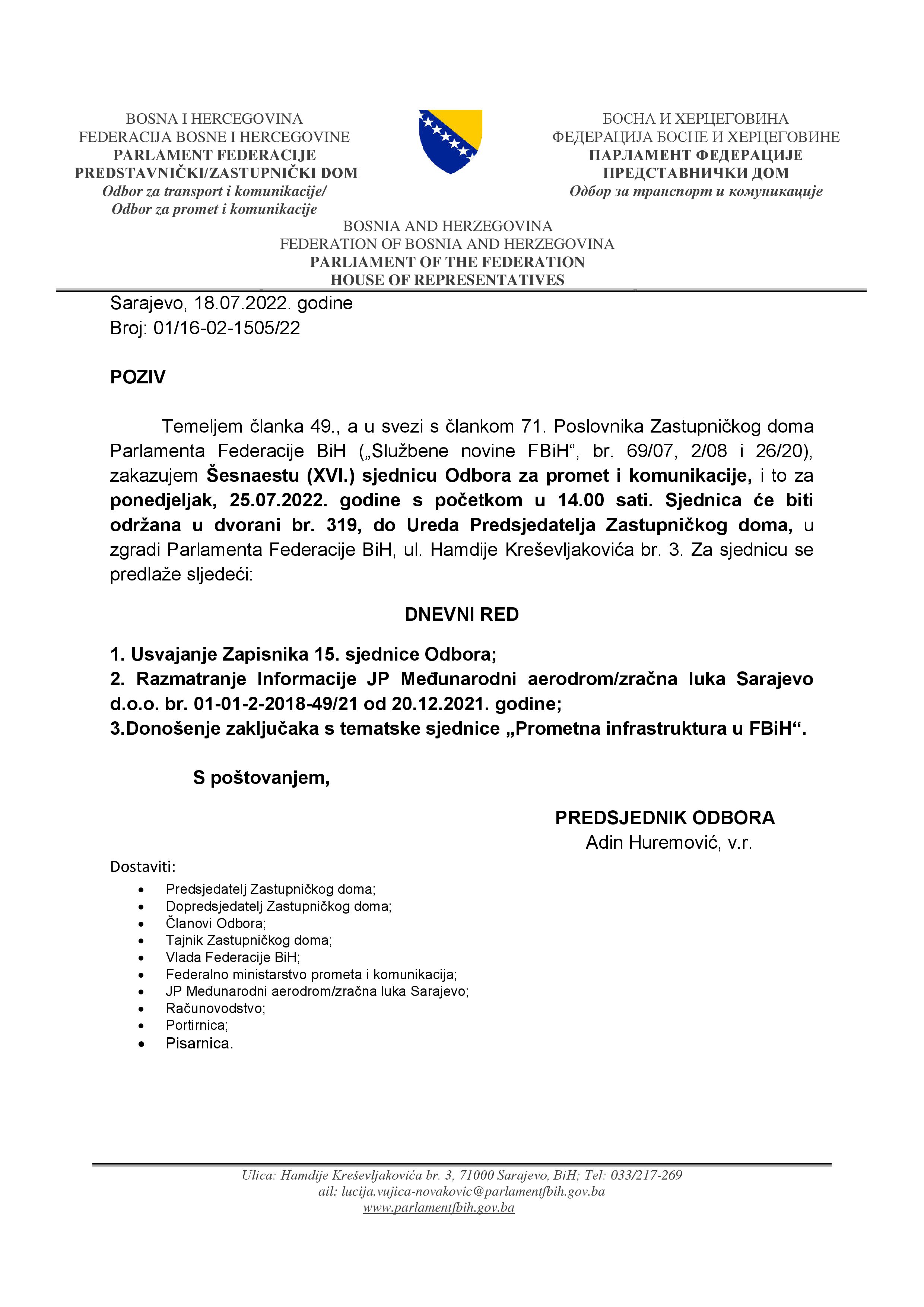 Poziv na 16. sjednicu Odbora za promet i komunikacije
