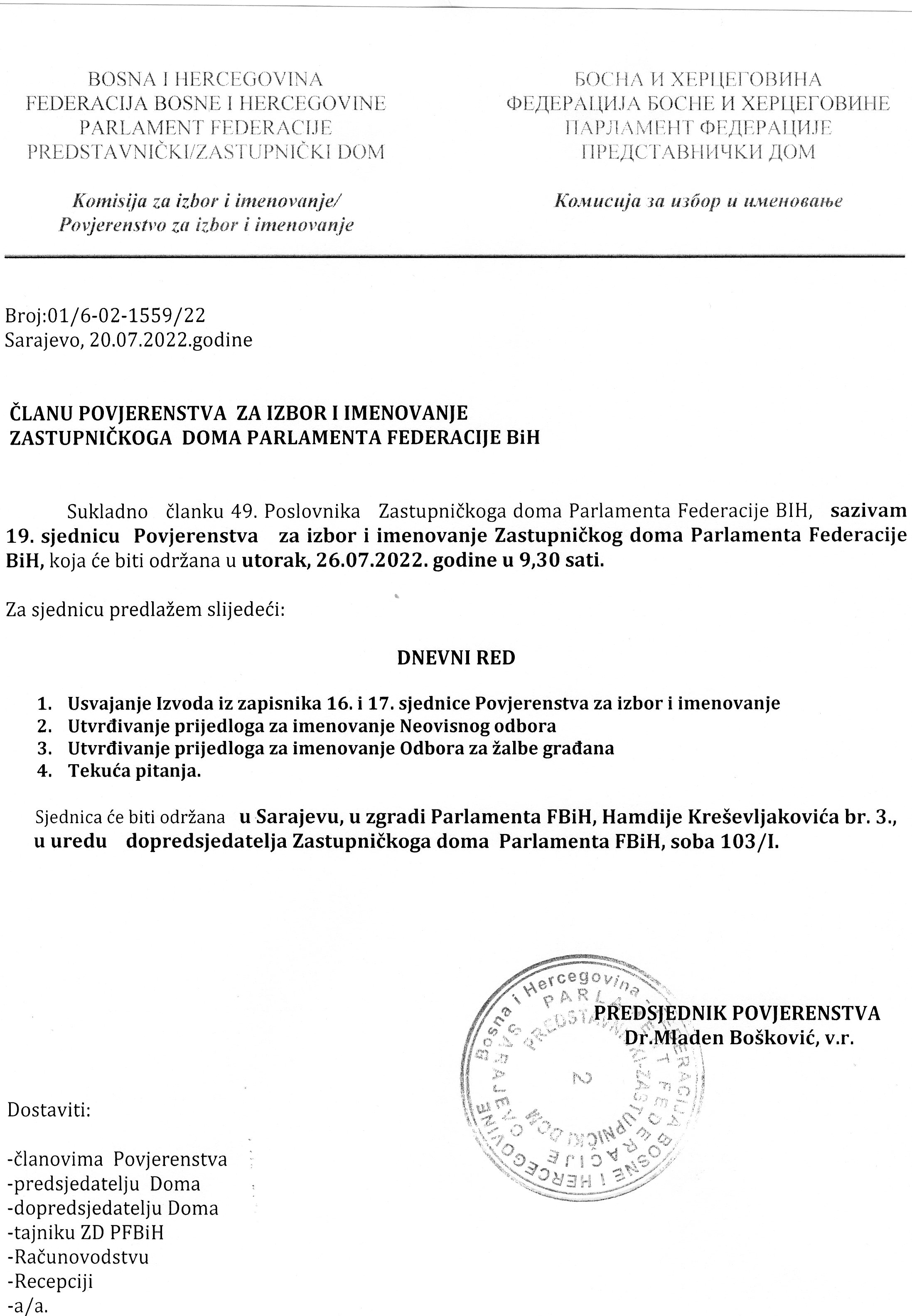 Poziv za 19. sjednicu Povjerenstva za izbor i imenovanje