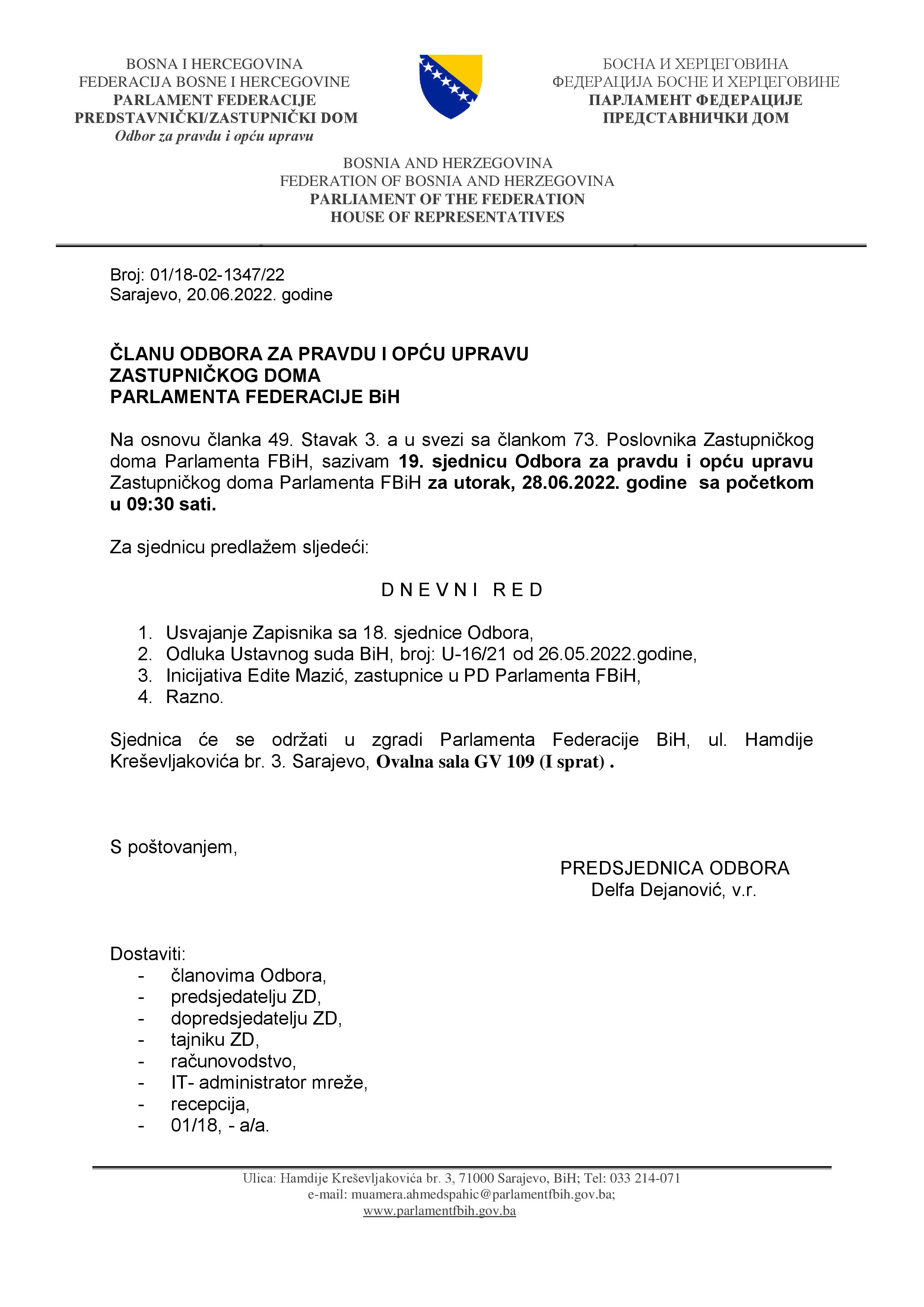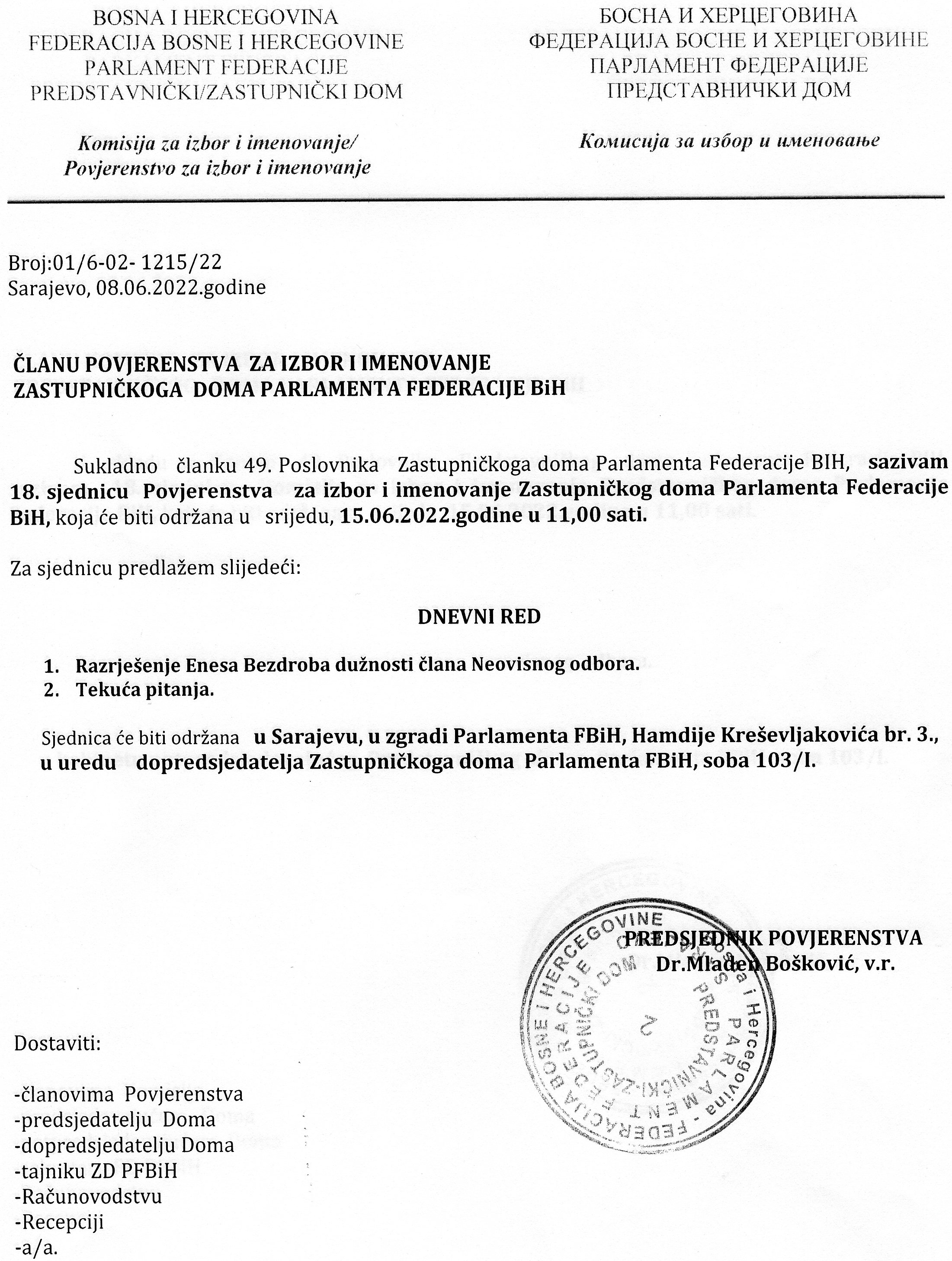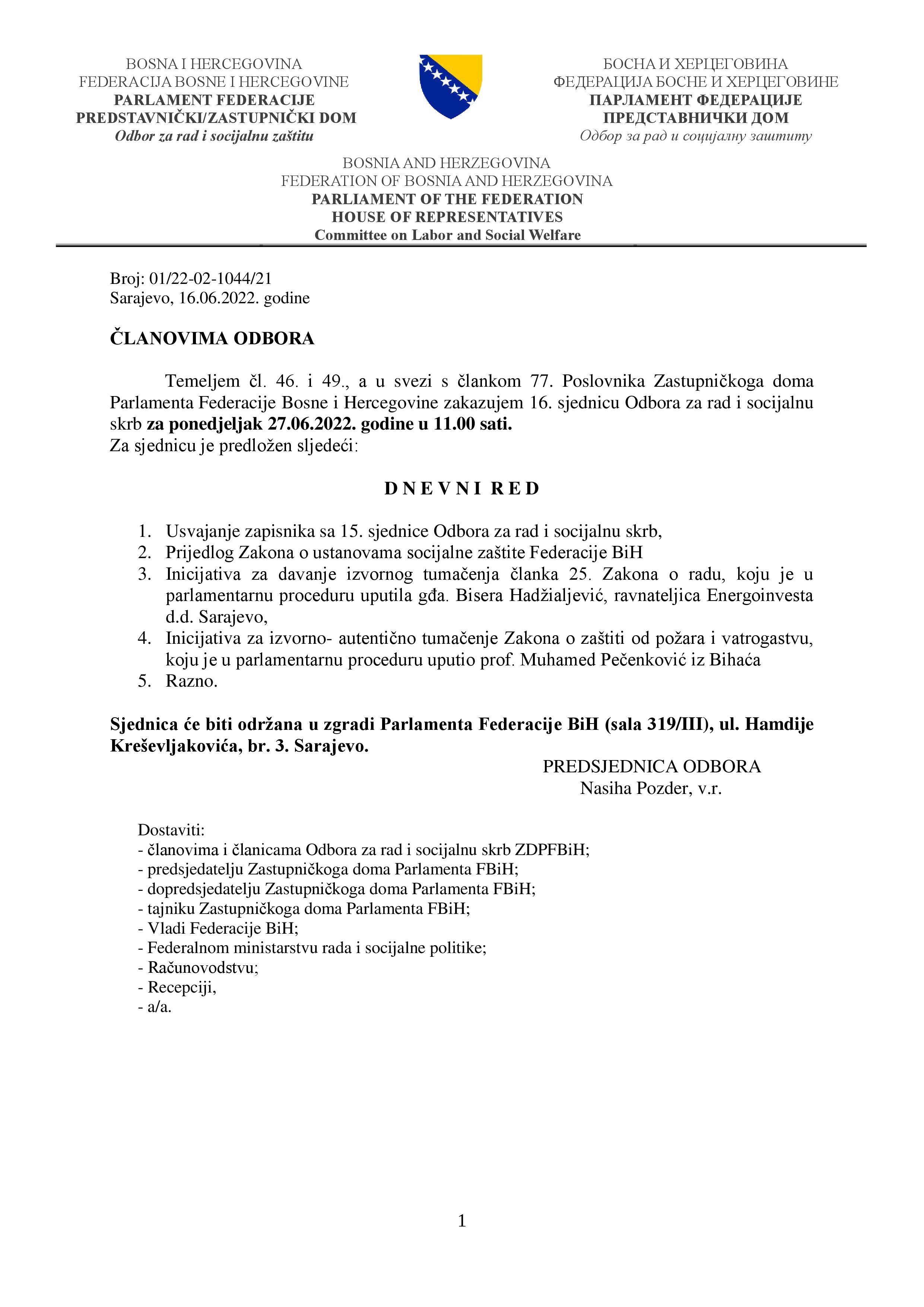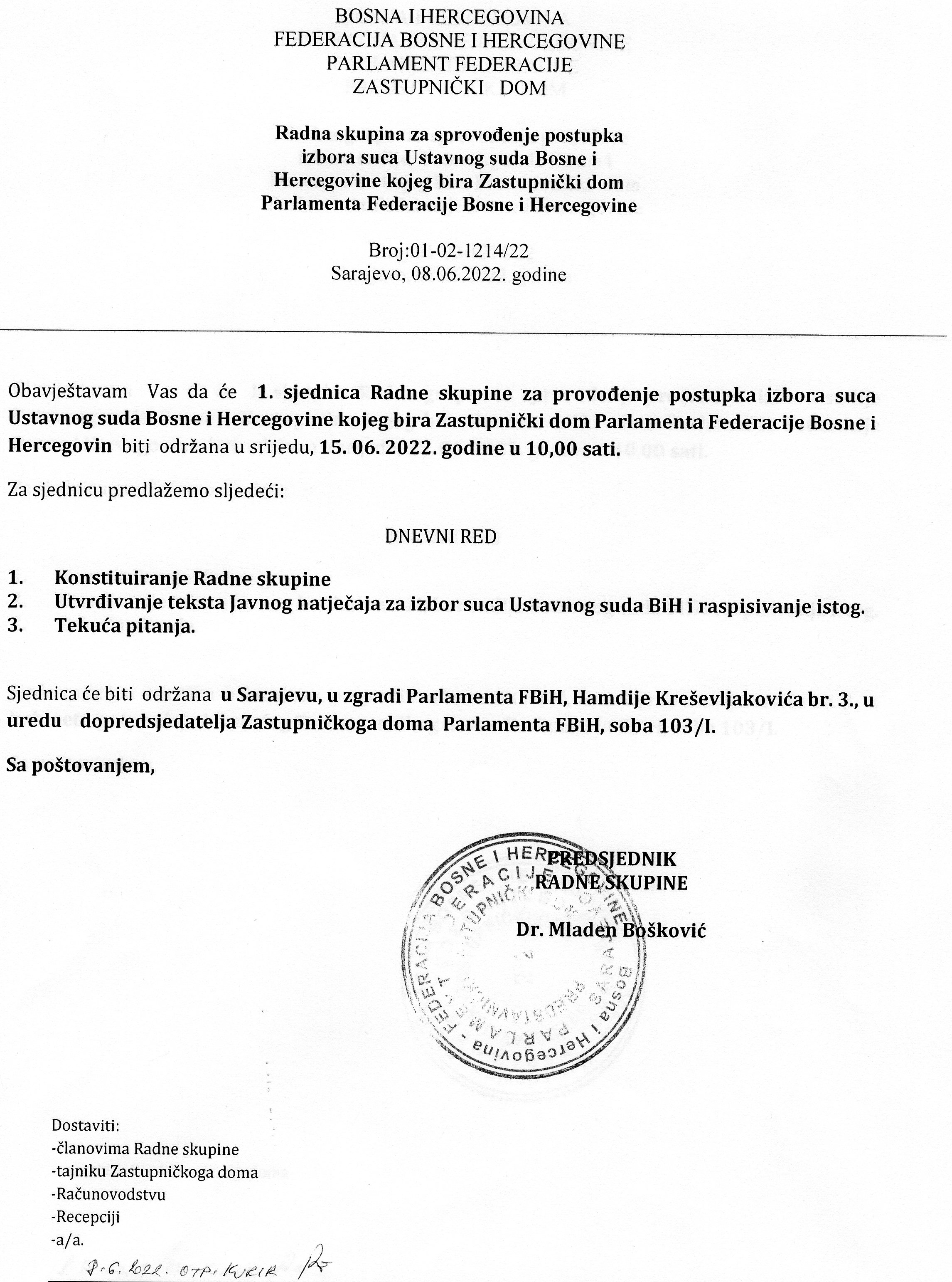 Poziv za 1. sjednicu Radne skupine za provođenje izbora suca Ustavnog suda Bosne i Hercegovine 13.06.2022 Najave HR Pročitaj više