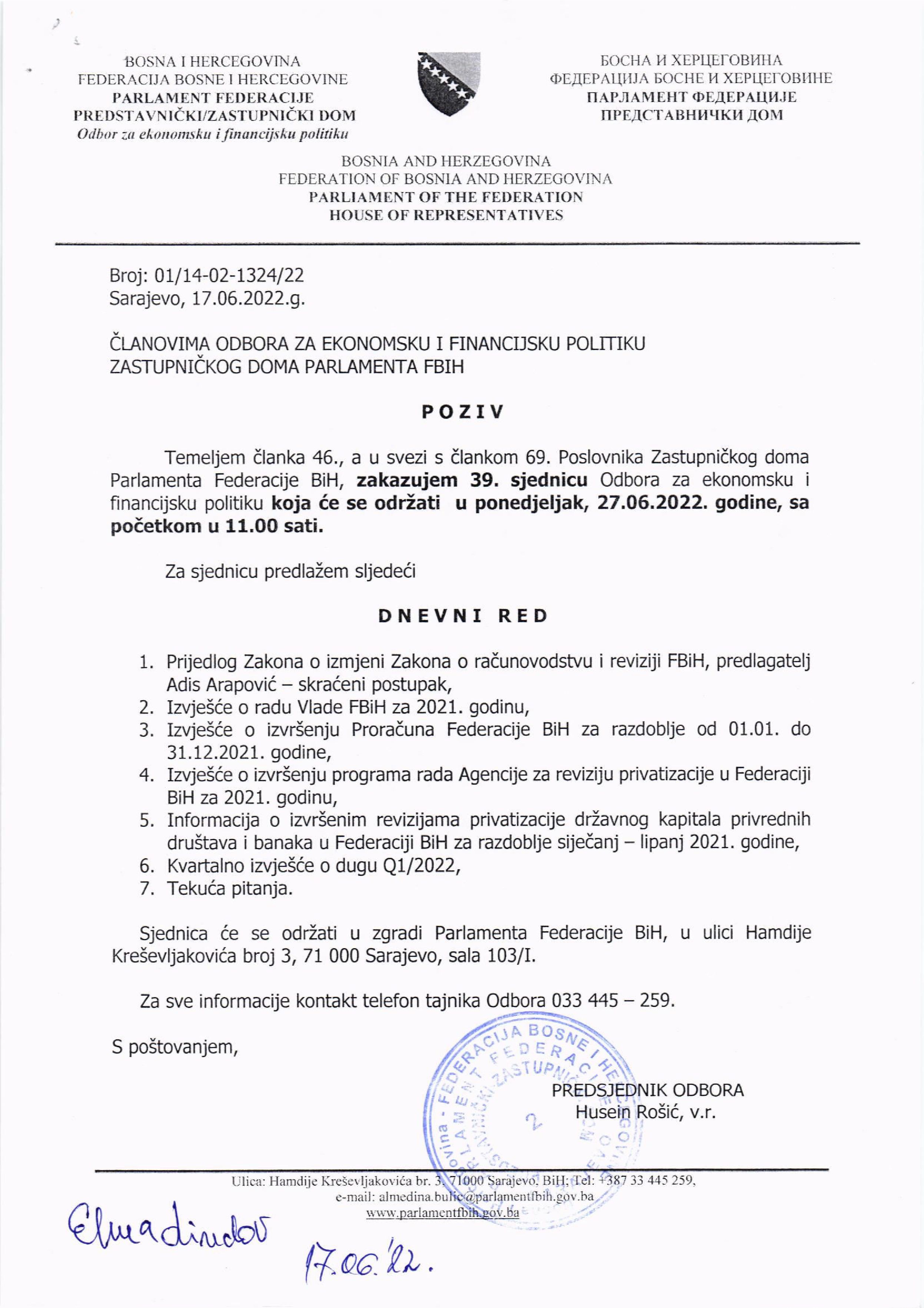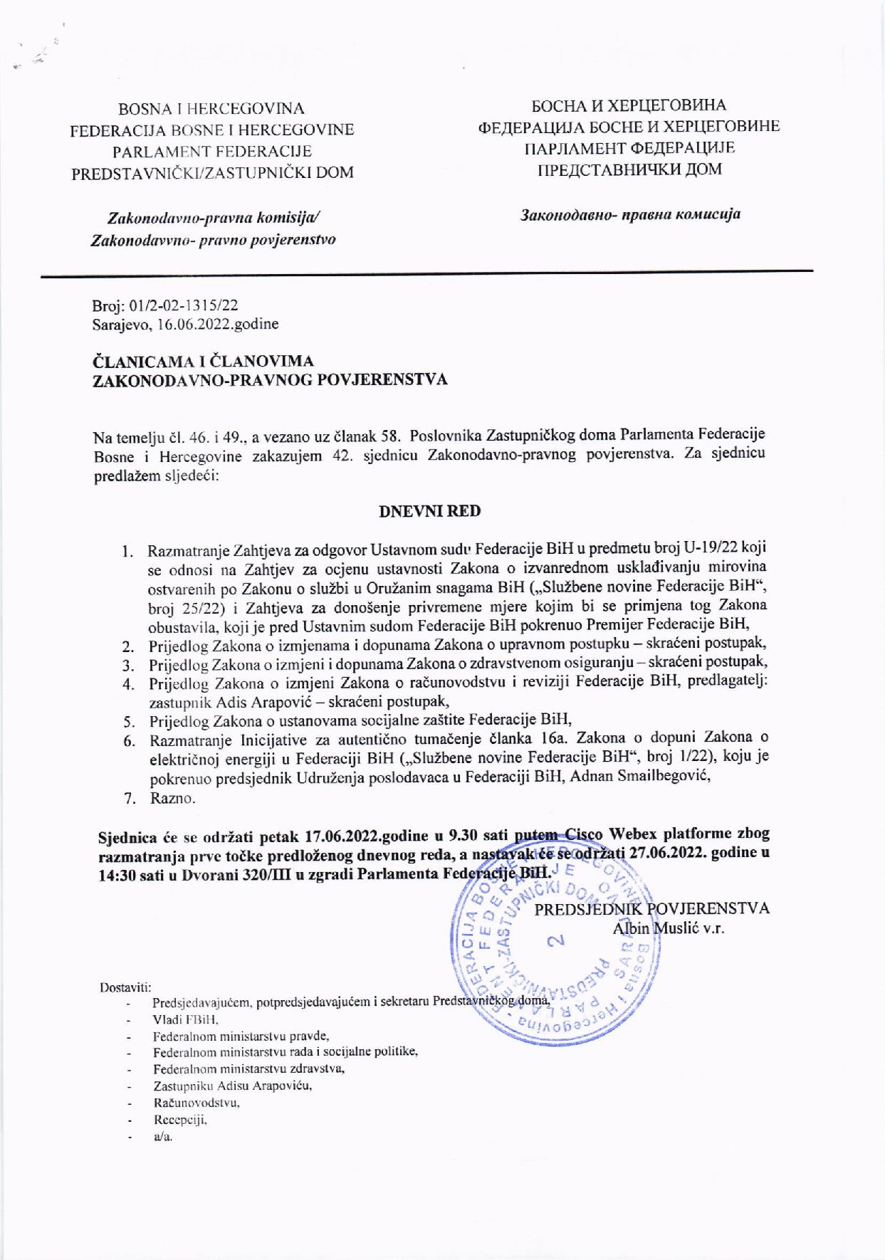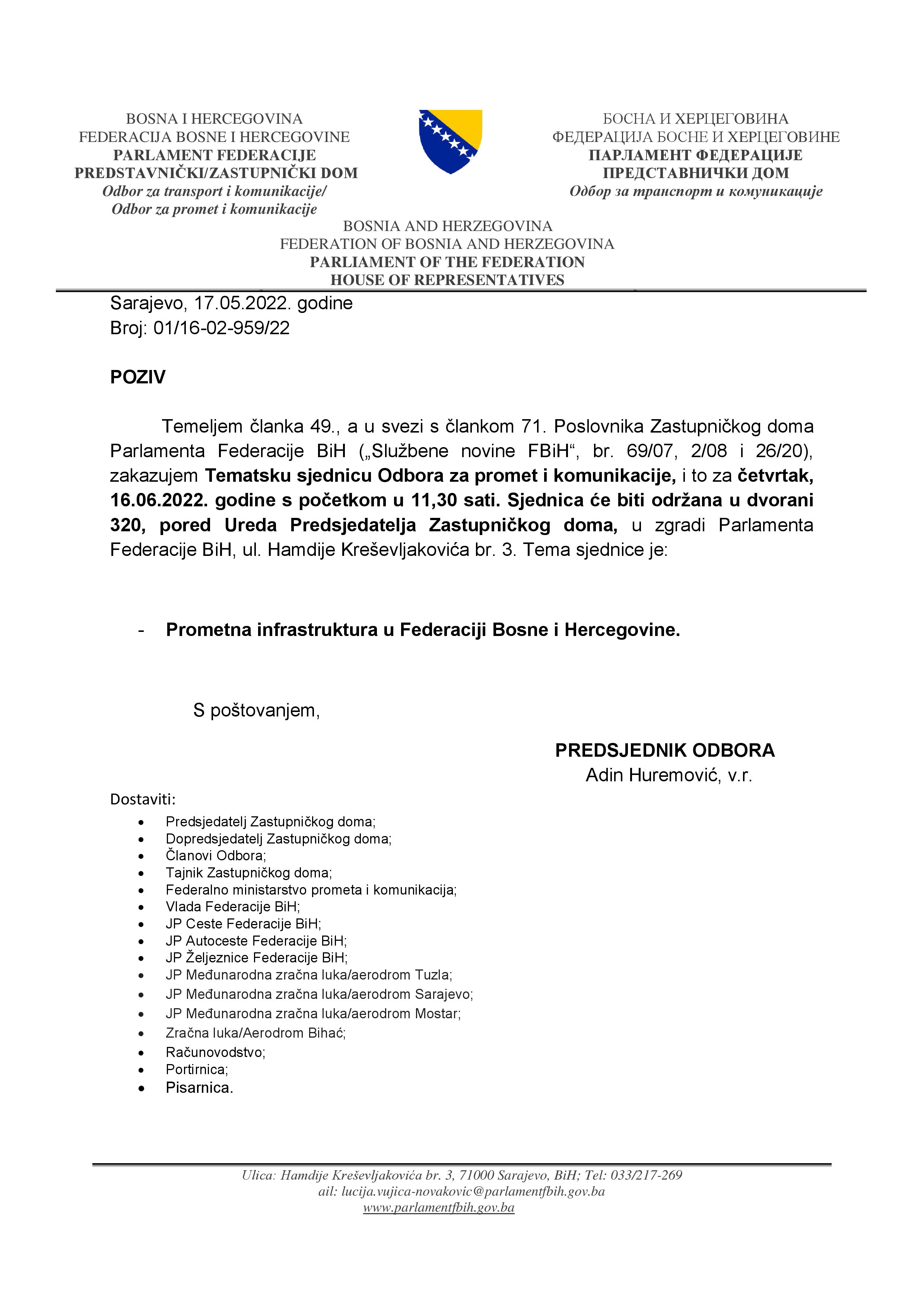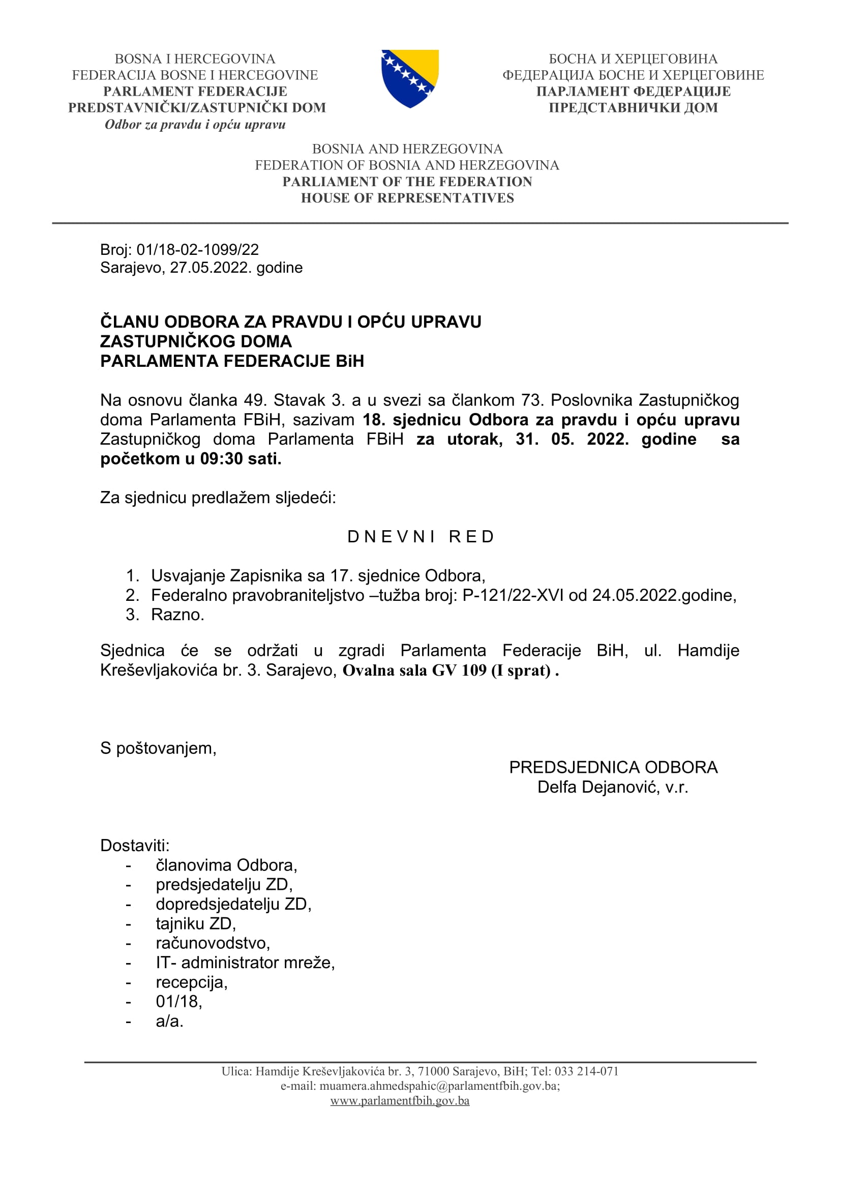 Poziv za 1. sjednicu Radne skupine za provođenje izbora suca Ustavnog suda Bosne i Hercegovine 13.06.2022 Najave HR Pročitaj više