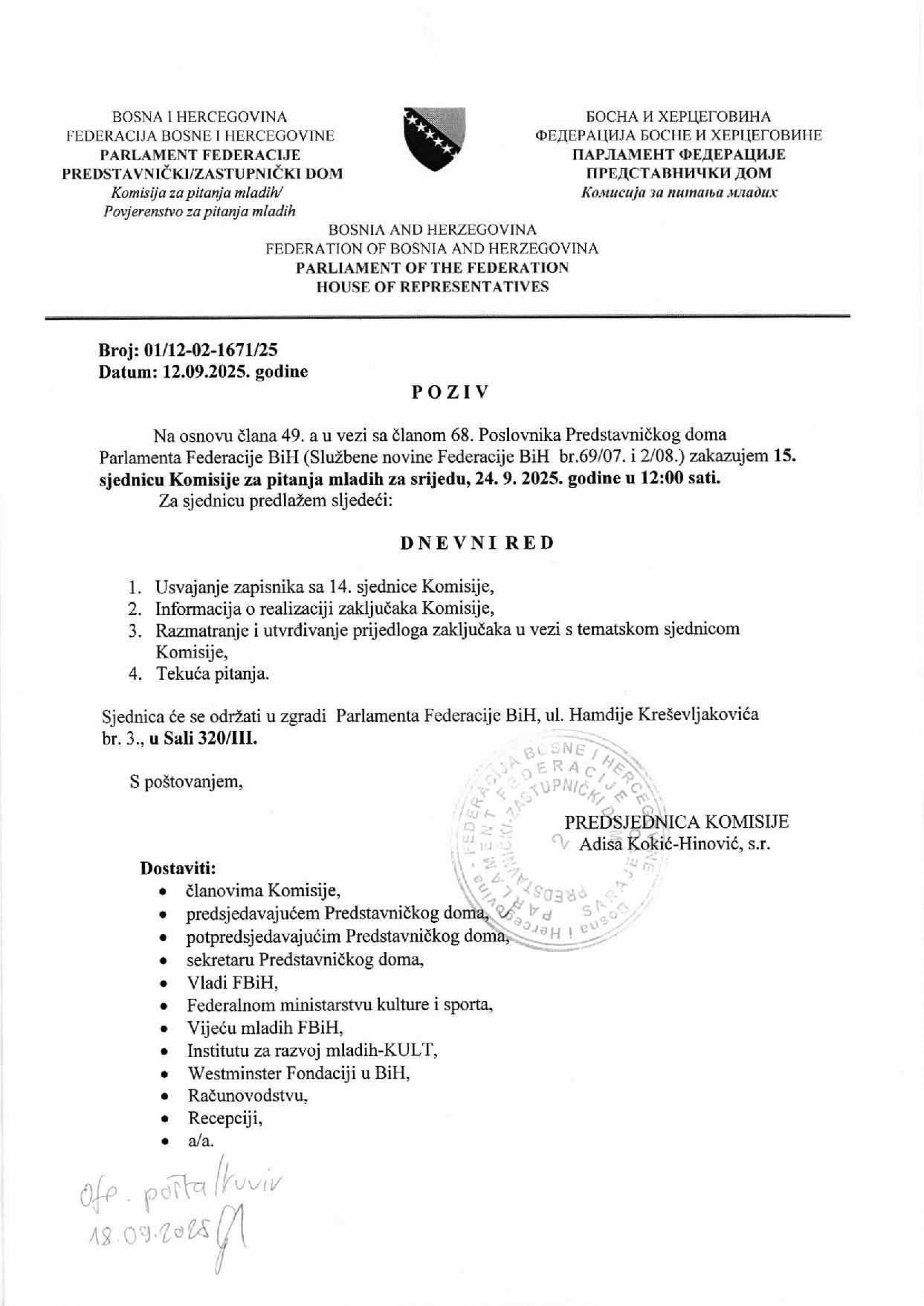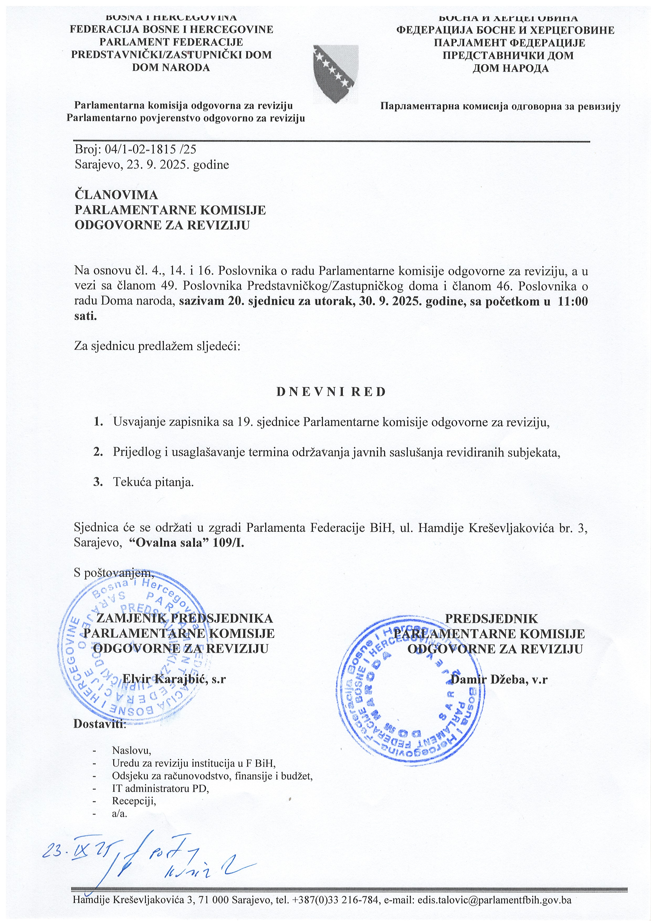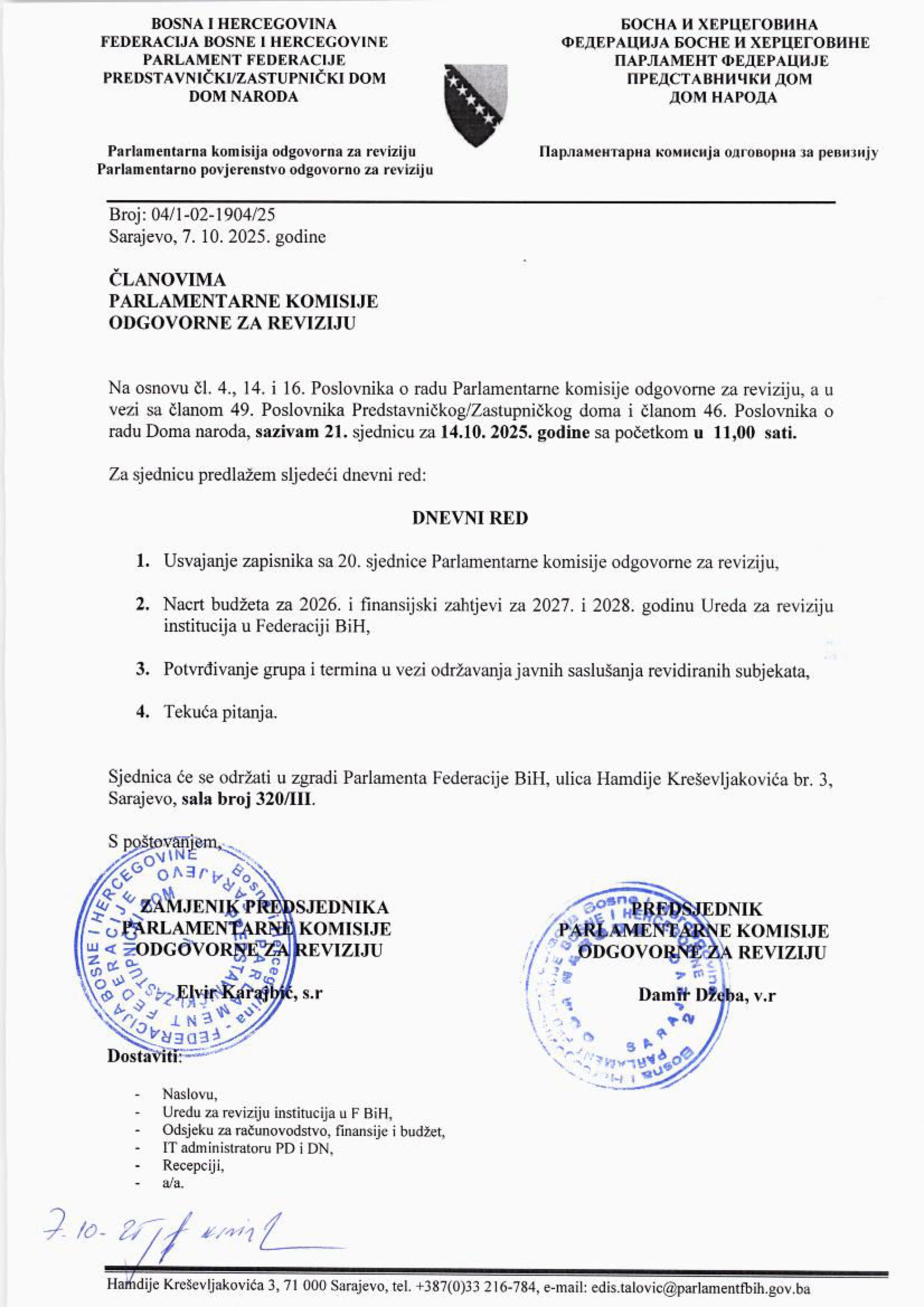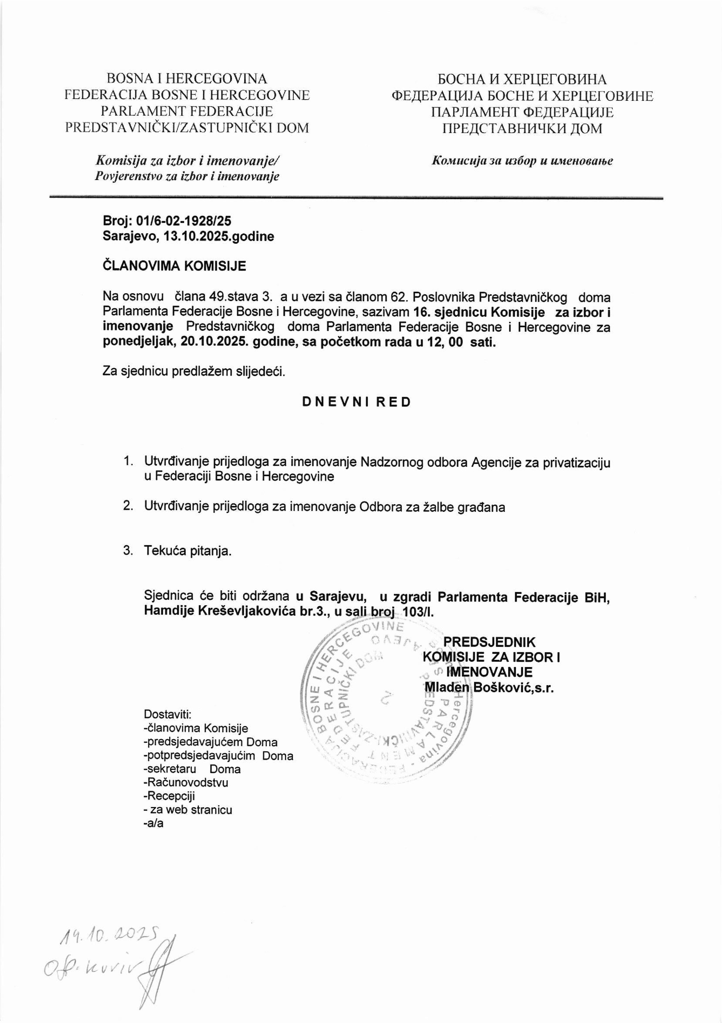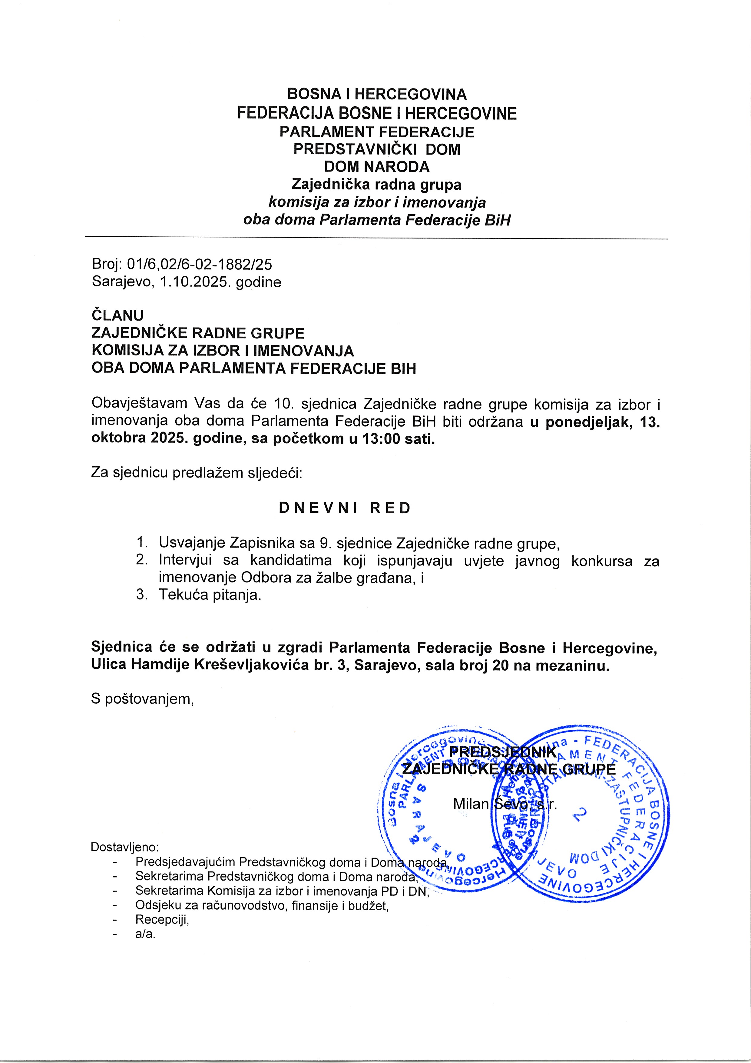 Poziv za 10. sjednicu Zajedničke radne grupe komisija za izbor i imenovanje oba doma Parlamenta FBiH 06.10.2025 Najave Pročitaj više