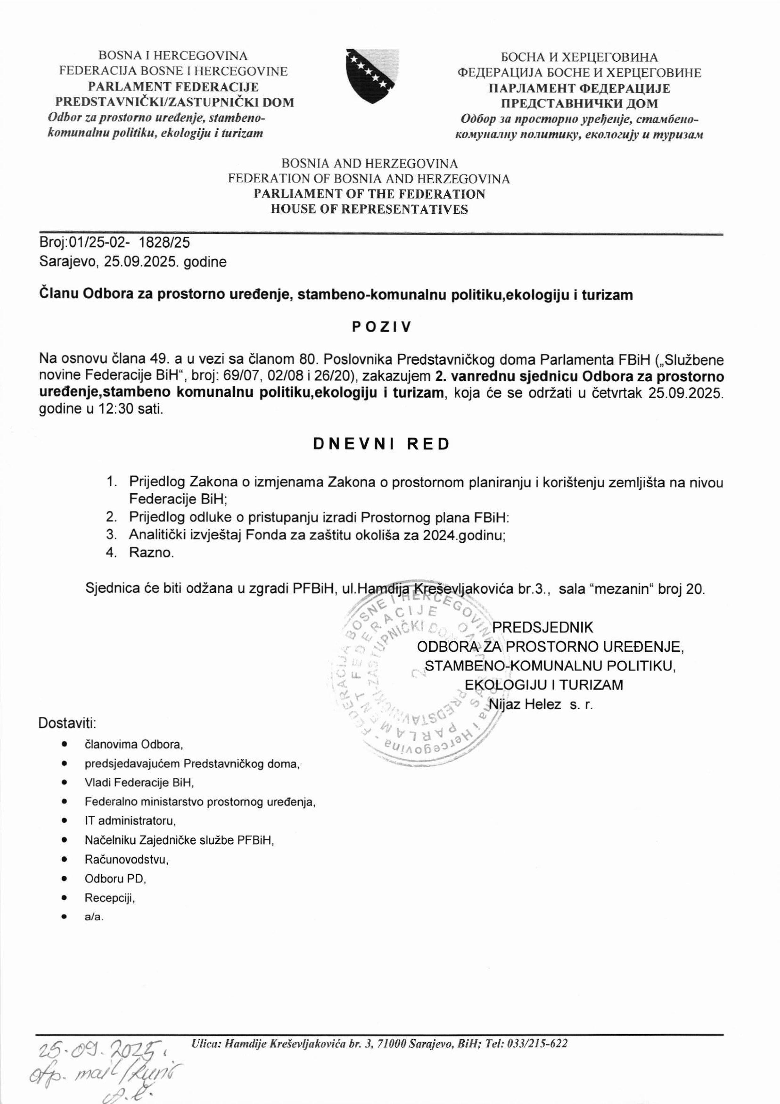 Poziv za 2. vanrednu sjednicu Odbora za prostorno uređenje, stambeno-komunalnu politiku, ekologiju i turizam 25.09.2025 Najave Pročitaj više