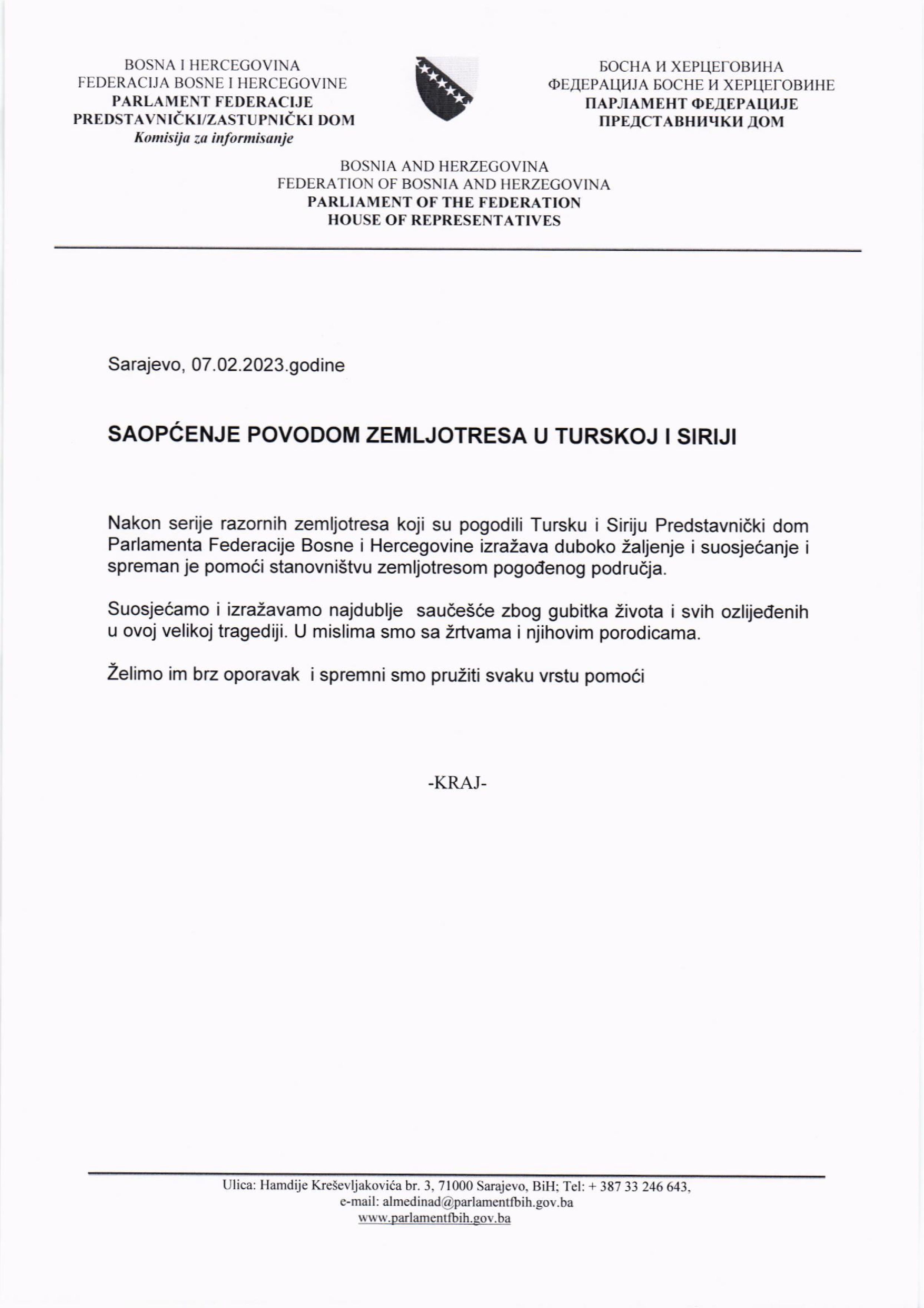 Predsjedavajuća Predstavničkog doma Parlamenta FBiH uputila telegram saučešća ambasadoru Republike Turske 07.02.2023 Vijesti Pročitaj više